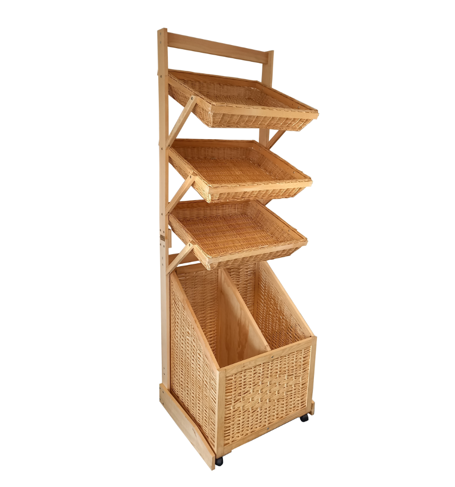 Ce présentoir à pain en osier naturel est parfait pour les boulangeries et les espaces de vente.