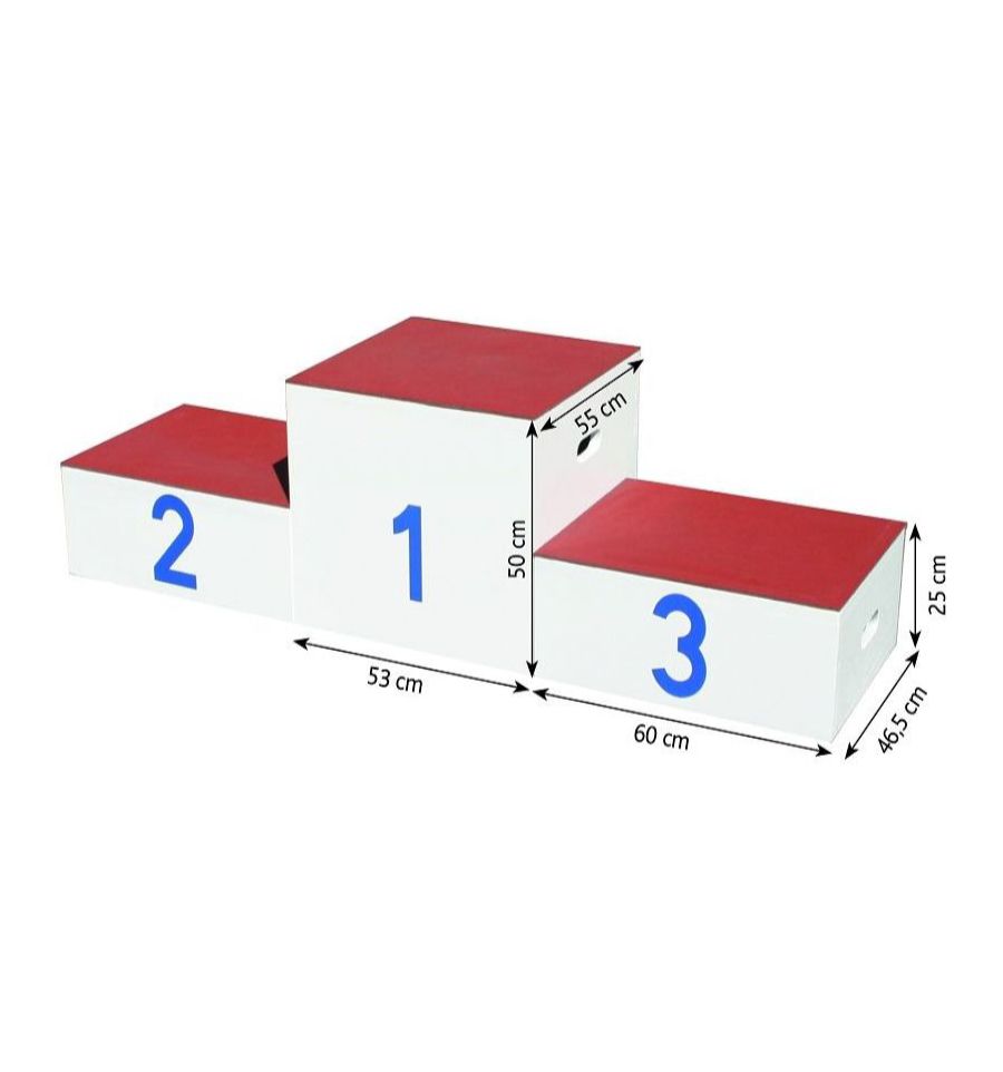 Podium de sport 3 places en bois pour récompenser les sportifs, composé de 3 blocs qui s'encastrent les uns dans les autres pour un faible encombrement lorsque celui-ci est rangé.