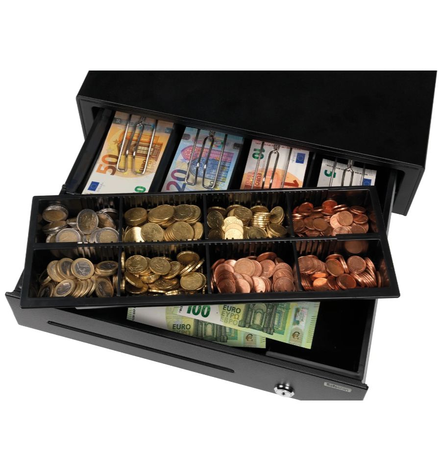 - Ergonomique : 4 compartiments à billets (réglables) et 8 bacs à pièces (amovibles).