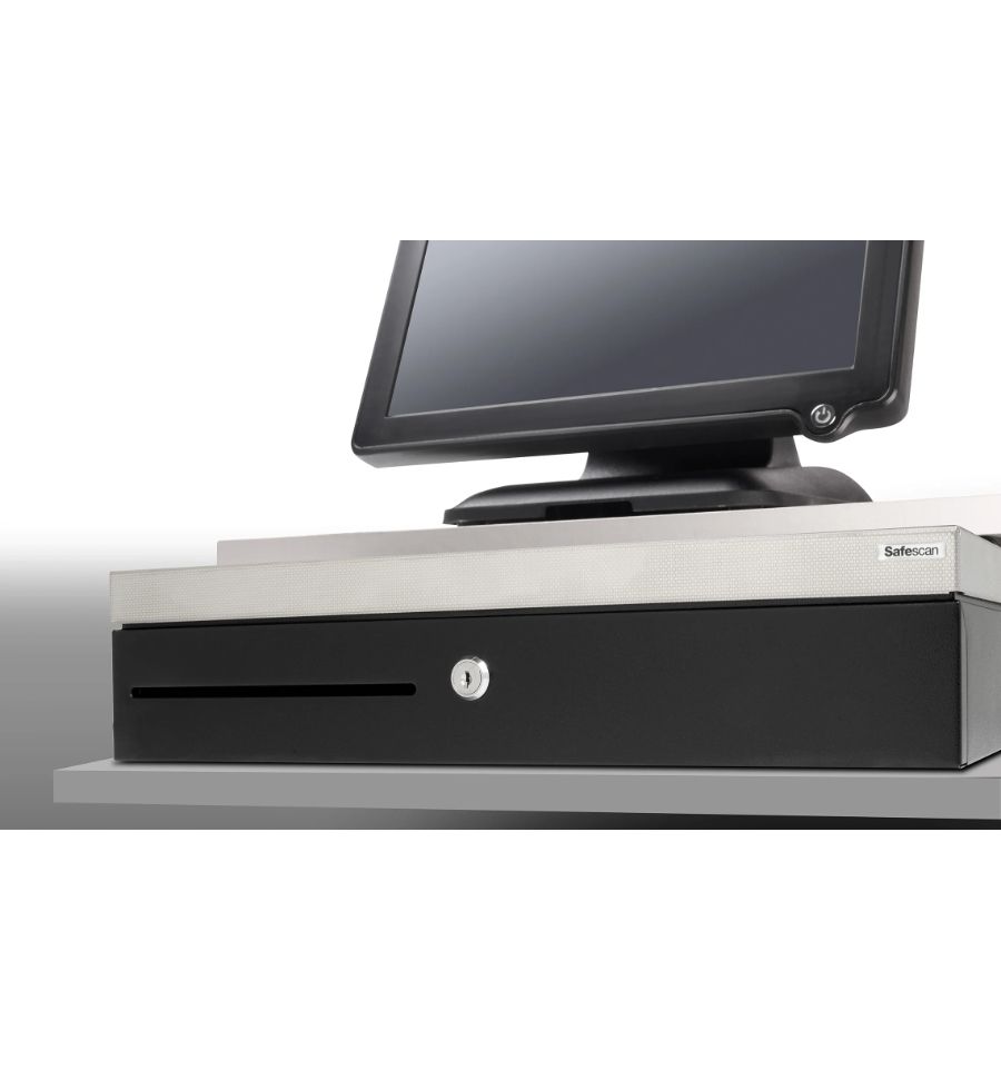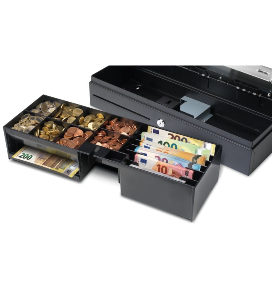 Tiroir caisse flip top usage normal Safescan SD-4617S de 46 x 17 cm équipé d'un tiroir à ouverture verticale électrique et par clé. Il dispose de 6 compartiments pour les billets et 8 pour les pièces.