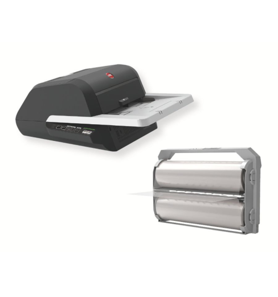 Cette machine à plastifier se distingue par l’utilisation d’un rouleau en plastique intégré dans l’appareil. Elle peut fonctionner en continu puisqu’il suffit d’insérer les documents entre les rouleaux pour qu’ils ressortent plastifiés. Une seule cartouche peut plastifier jusqu'à 250 documents. Vous pouvez choisir des cartouches de films compatibles de 75 à 125 microns.