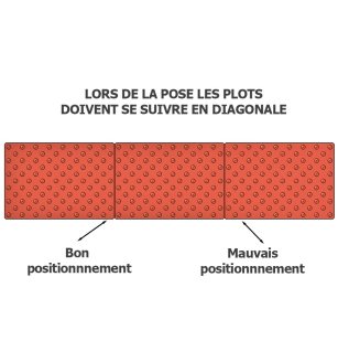 Afin de respecter la norme NF P98-351, il faut impérativement poser les dalles dans le bon sens. Pour cela, positionnez la dalle face au danger à signaler en gardant la largeur de 42 cm et en mettant les dalles les unes à côté des autres en faisant en sorte que les plots se suivent comme sur l'image ci-dessous.