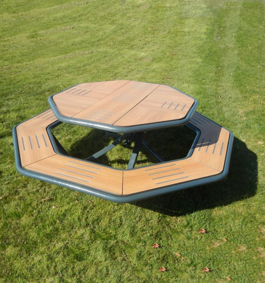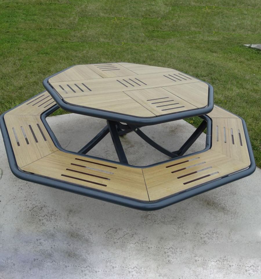 Équipez vos espaces urbains avec la table de pique nique hexagonale 8 places. Cette table conçue en acier et en bois stratifié compacte d'épaisseur 14 mm est dotée d'un traitement anti corrosion.