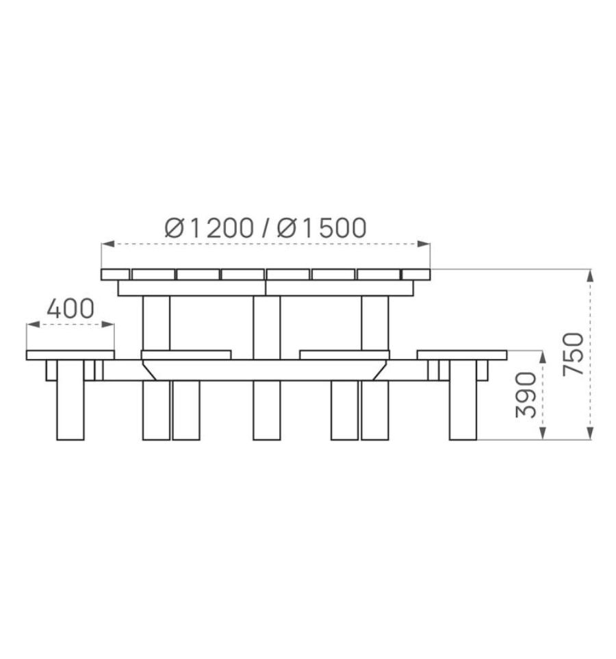 Disponible avec un plateau de diamètre 1200 mm ou 1500 mm, elle offre une assise pouvant accueillir 6 à 8 personnes selon la version choisie.