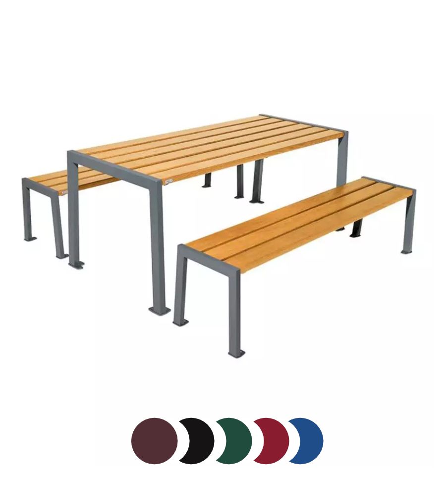 La structure en acier est disponible en 10 coloris. Les bancs sont inclus avec la table.