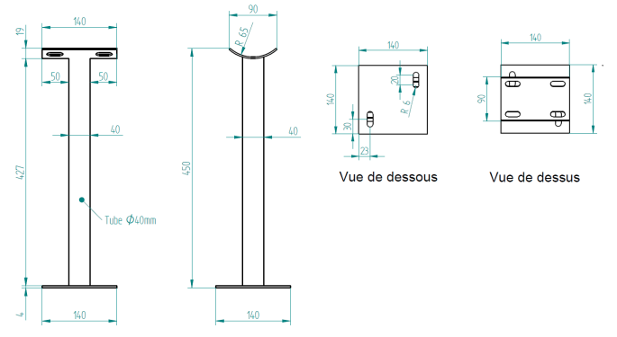 L'ensemble tube est soit une platine berceau en acier galvanisé à chaud, soit thermolaquée RAL 7008 sur l'ensemble de ce tube platine. Les platines font 140 x 140 mm et la fixation se fait par chevilles mécaniques (en option).