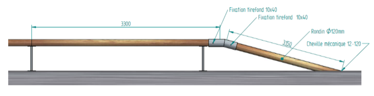 Les extrémités abaissées sont : 1 lisse Ø12 cm longueur 3,30m, 1 manchon galvanisé ou thermolaqué avec angle à 170° et 1 lisse Ø12 cm, longueur 3,15 m biseautée.