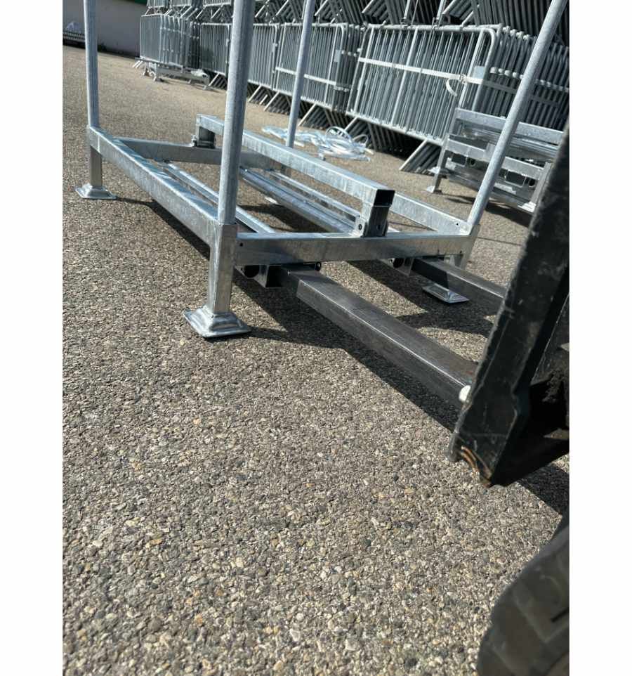 Elle peut accueillir entre 20 et 25 barrières (selon le modèle et le rangement). La charge totale admissible est de 300 kg. Sa manipulation peut être effectuée grâce à un gerbeur ou un chariot élévateur.