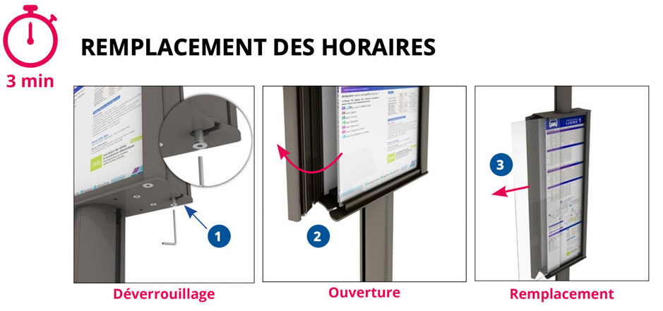 Notre poteau d'information est pratique à manipuler, le changement d'horaire s'effectue rapidement.