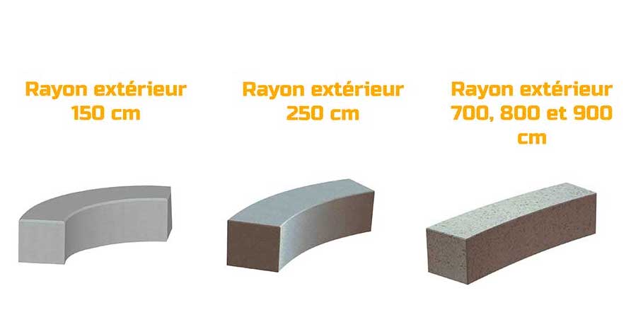 Le rayon extérieur va définir la courbure de la banquette. Avec ses différents rayons extérieurs, la banquette extérieure courbée en béton va pouvoir avoir différentes formes et donc proposer différents agencements.
