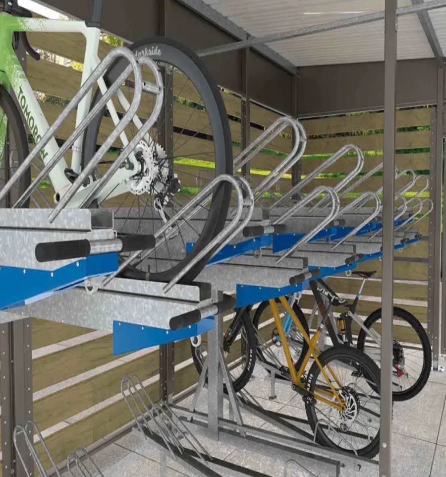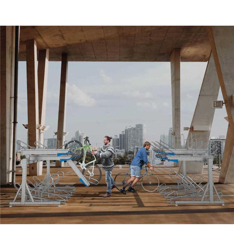 Ce support à vélo permet de ranger 12 vélos (6 places par étage) et de limiter l'encombrement dans des espaces extérieurs grâce à son double étage.