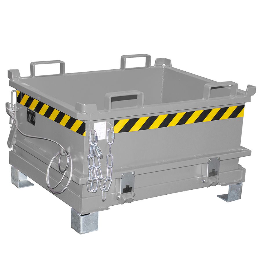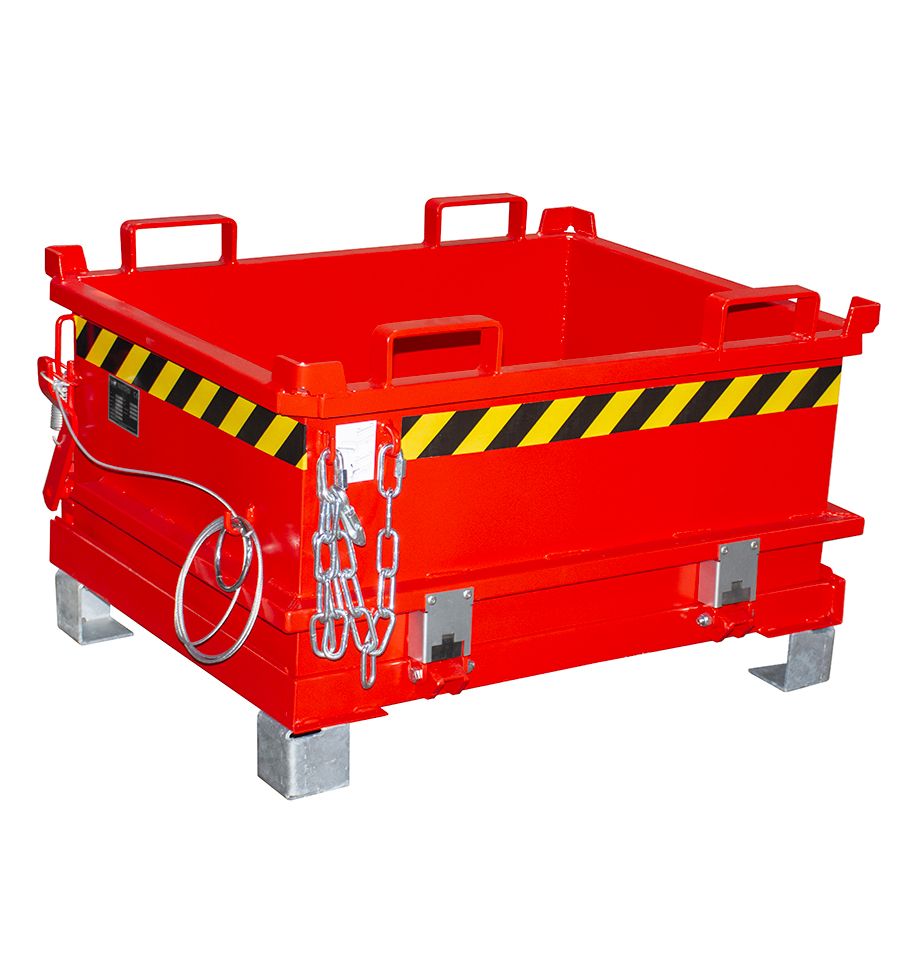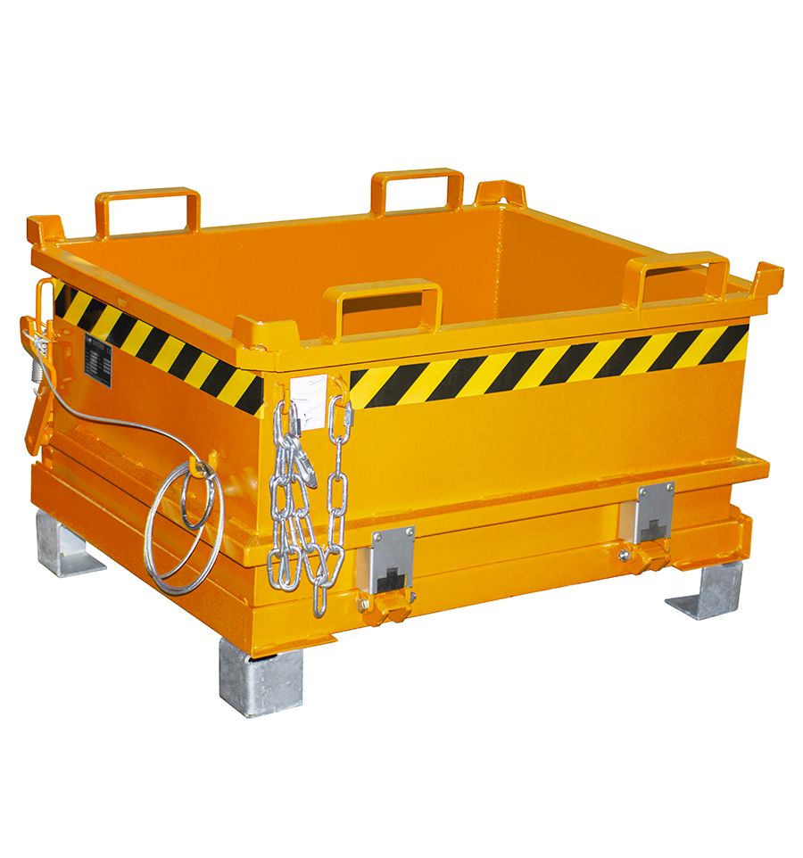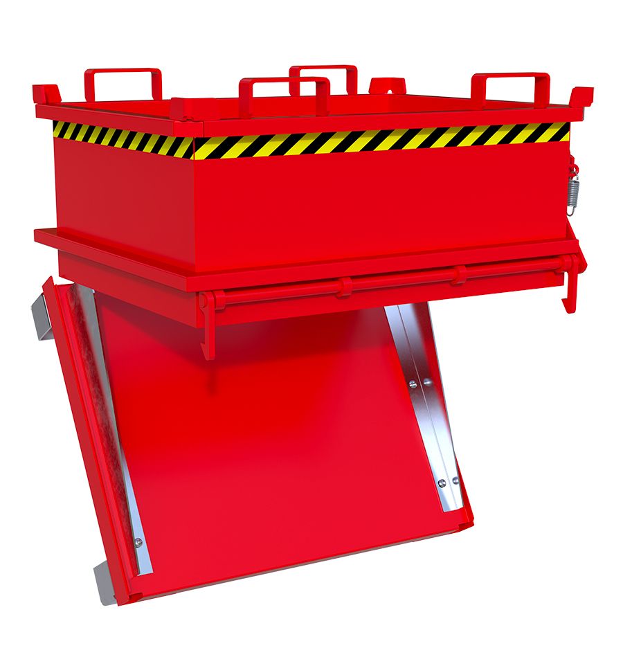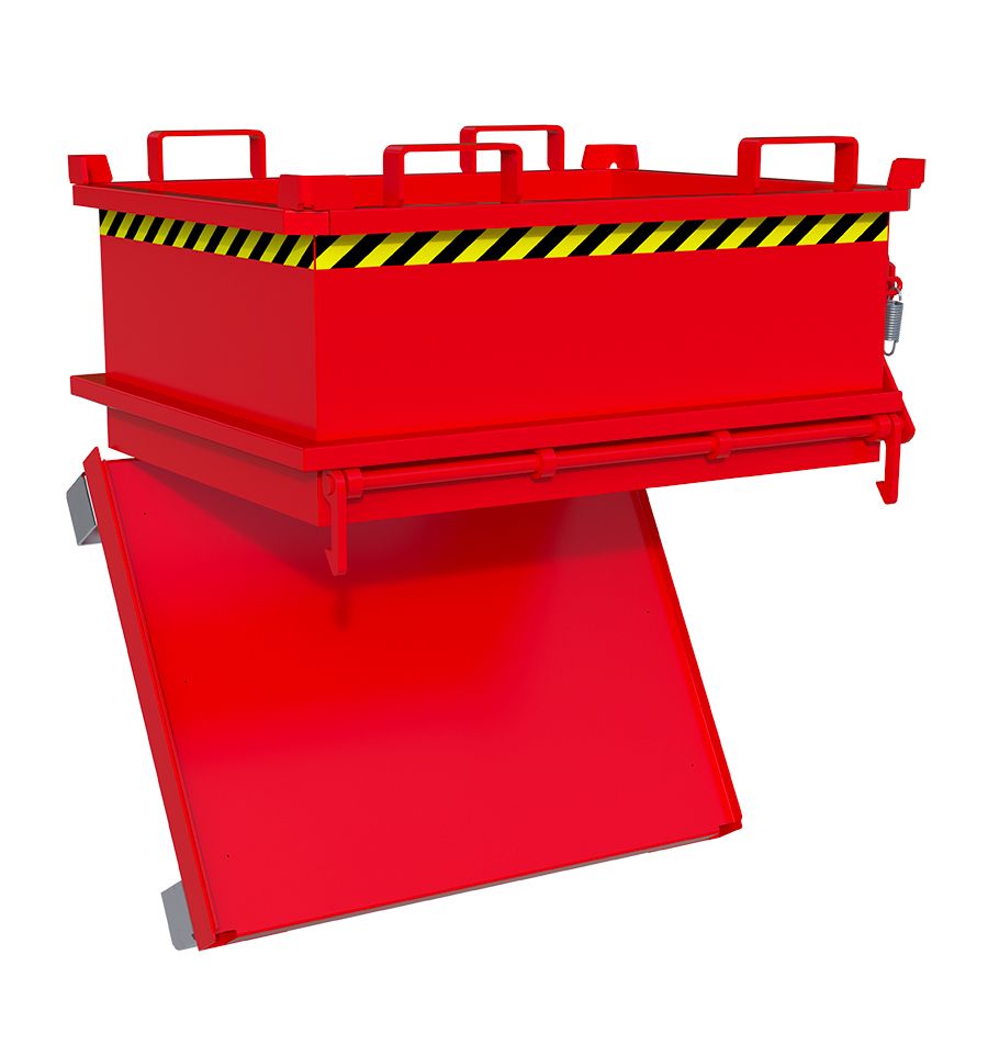 Tôle en acier laquée robuste, renforcée aux angles et au niveau des anneaux de levage, permettant d'accueillir les fourches d'un chariot élévateur pour être vidée. Parois intérieures lisses. Le fond de la benne peut être équipé de tôles latérales de centrage sur demande de devis.
