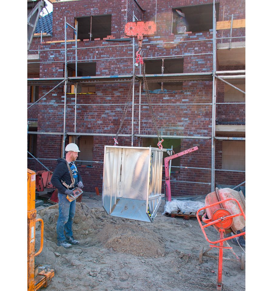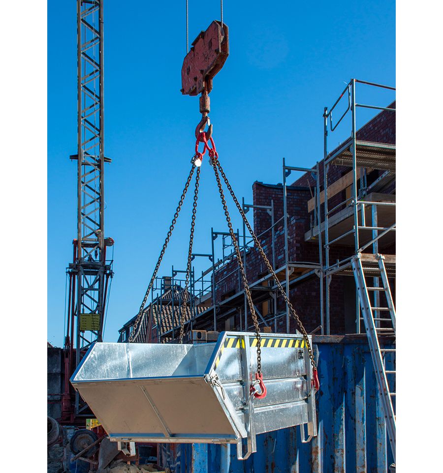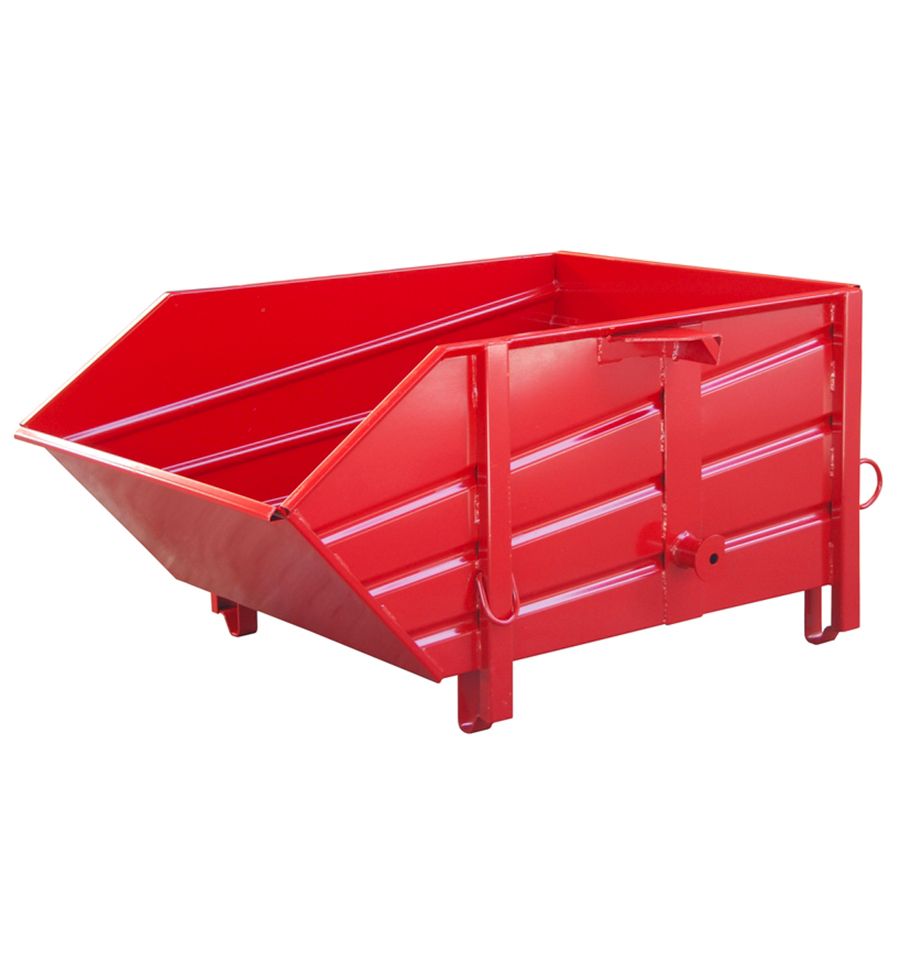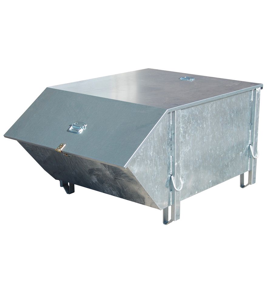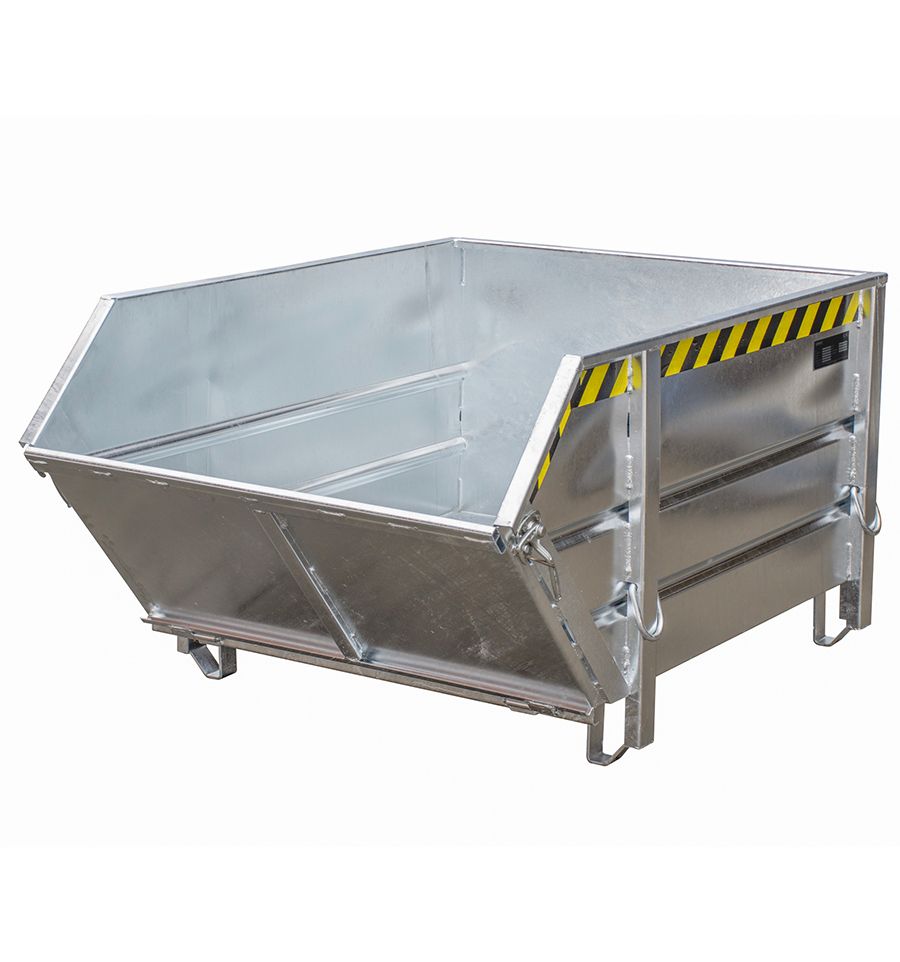 - Matière : Tôle en acier laquée, renforcée aux angles et au niveau des anneaux de levage, permettant à cette benne d'être manipulée et vidée à l'aide d'une grue.