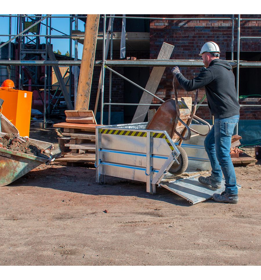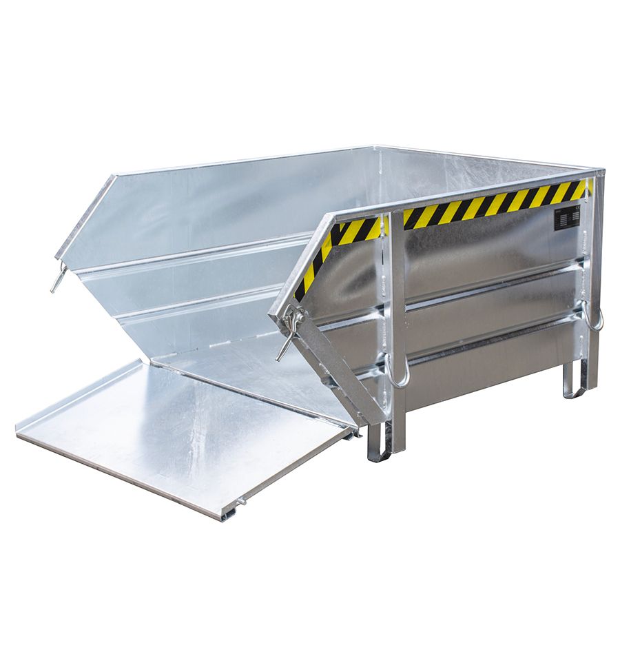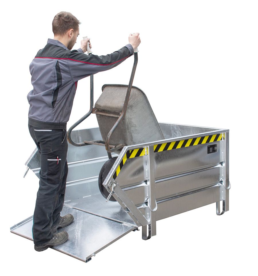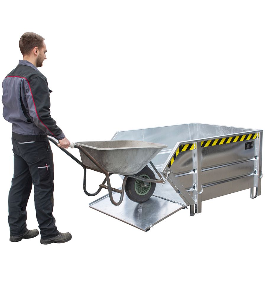 - Le modèle avec paroi rabattable permet de déverser les déchets à l'intérieur de la benne à l'aide d'une brouette.