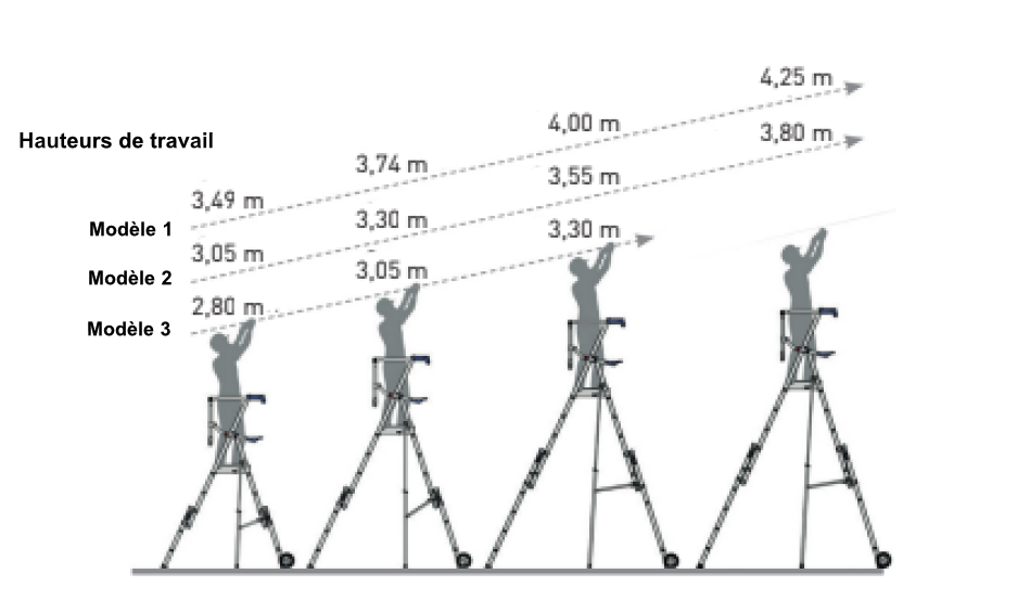 Pour l'ensemble des différentes hauteurs de travail, il convient de déplier les deux stabilisateurs à réglage millimétrique afin de renforcer la sécurité.