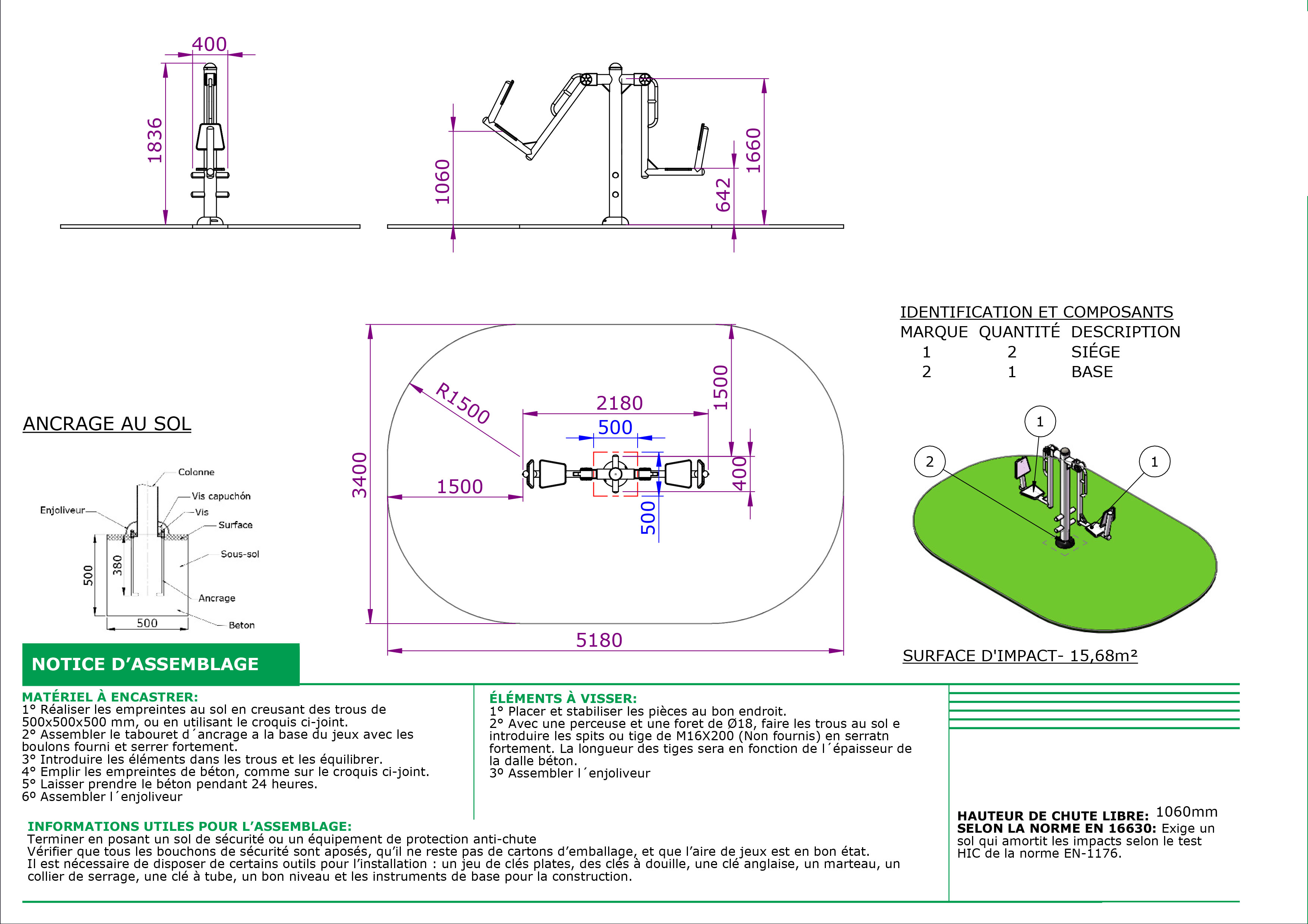 Notre presse pectorale est conforme à la norme EN 16630 assurant ainsi la sécurité des utilisateurs (ne nécessite pas de sol amortissant selon le test HIC de la norme EN 1176).