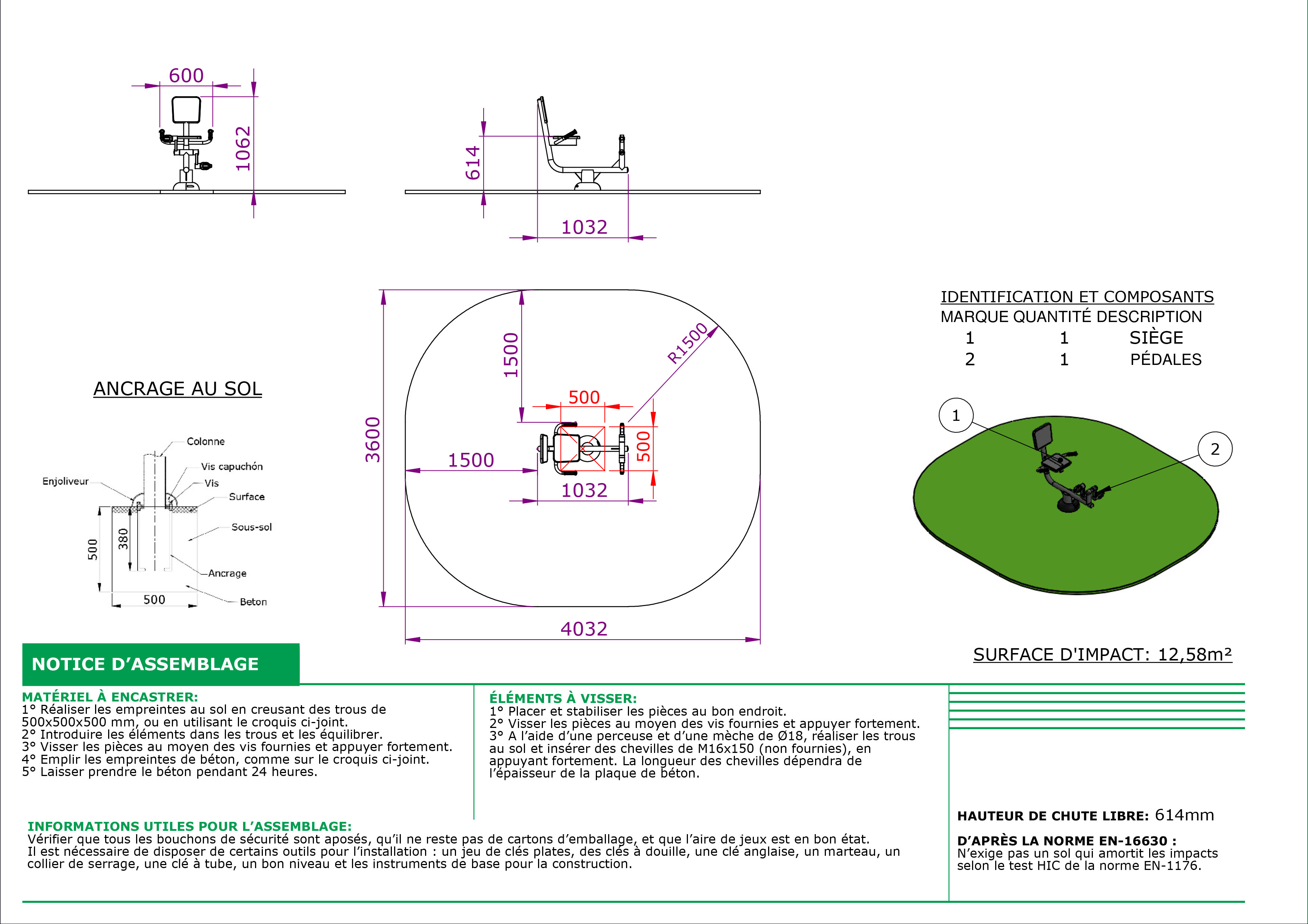 Le module rameur extérieur doit être installé dans une zone dégagée afin de ne pas gêner son utilisation. Il peut être utilisé par les personnes mesurant plus de 1,40 m. Pour plus d’informations, nous vous invitons à consulter la notice de montage présente dans la rubrique "téléchargement".