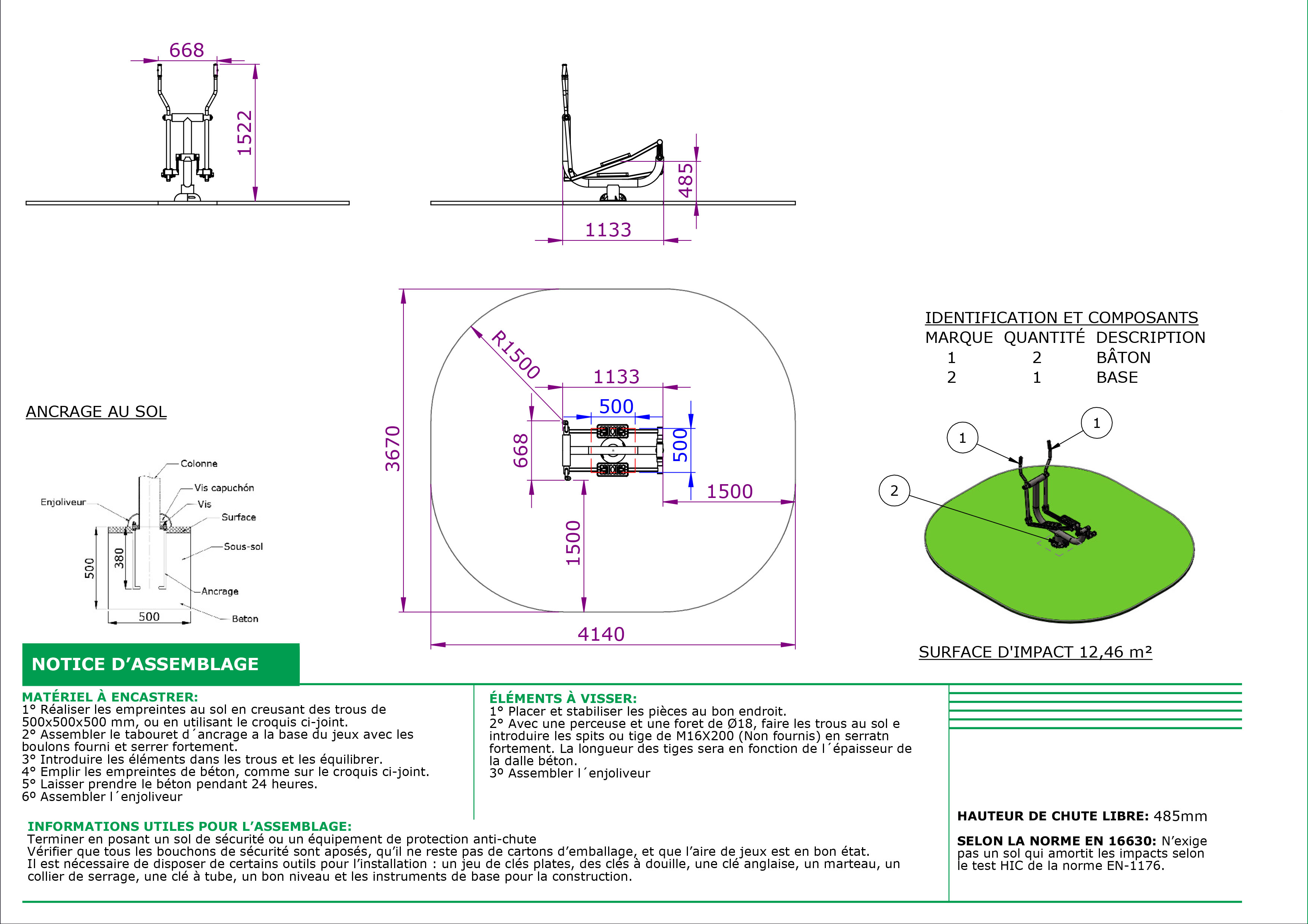 Le vélo elliptique fitness extérieur est conforme à la norme EN 16630 et nécessite un sol qui amortit les impacts (selon le test HIC de la norme EN 1176).