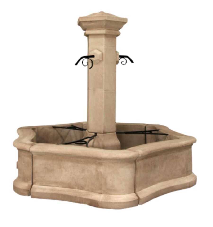 De dimensions 176 x 166 cm avec une hauteur de 157 cm, cette dernière est livrée avec : 6 éléments bassin, 1 base colonne, 1 colonne, 1 chapeau, 3 barres de ferronnerie, 3 becs verseurs.