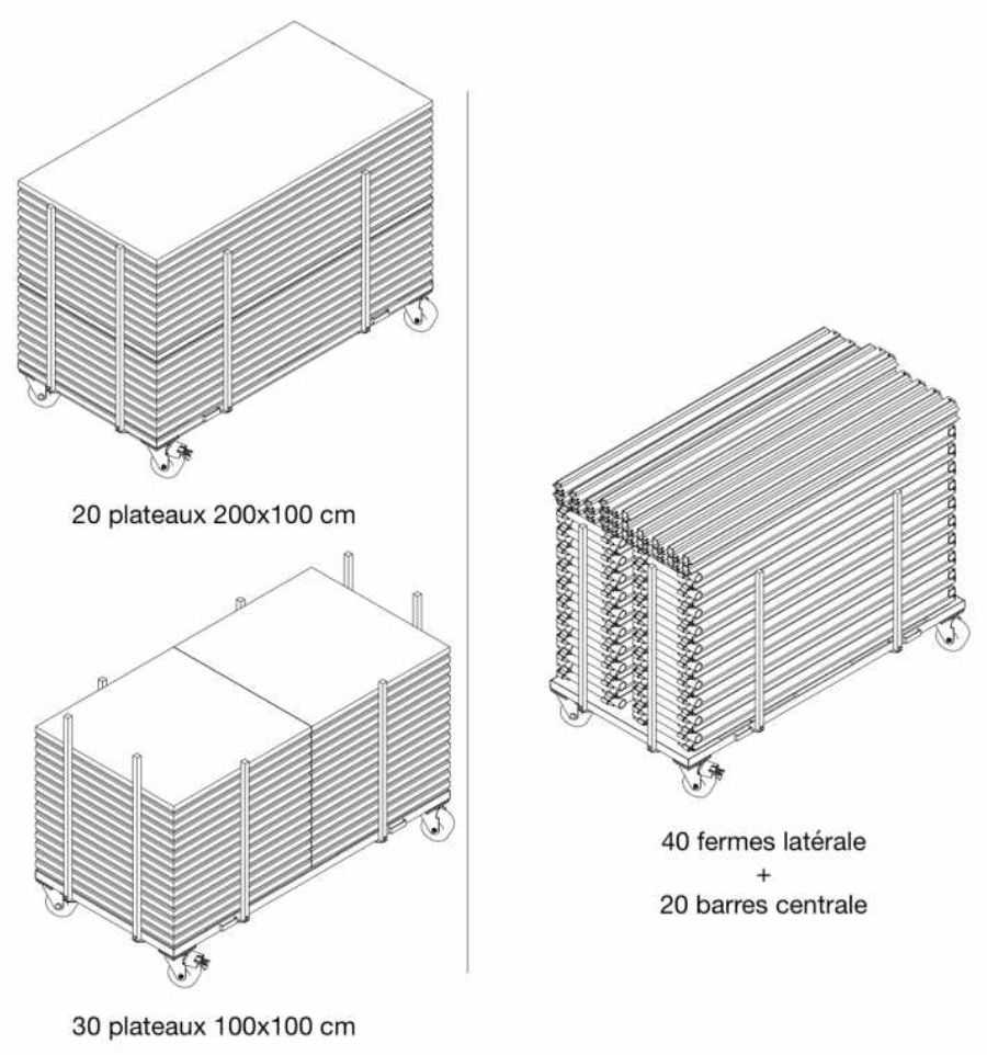 - Transport de 20 plateaux de 200 x 100 cm ou 30 plateaux de 100 x 100 cm.