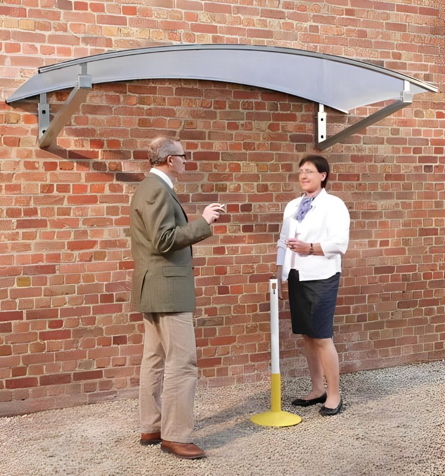 Cet auvent mural de 2 m² à fixer sur un mur est idéal si vous n'avez pas la place d'installer un abri fumeur à poser sur le sol. Sa structure est en acier et son toit en polycarbonate alvéolaire, ce qui le rend transparent et particulièrement robuste face aux chocs.