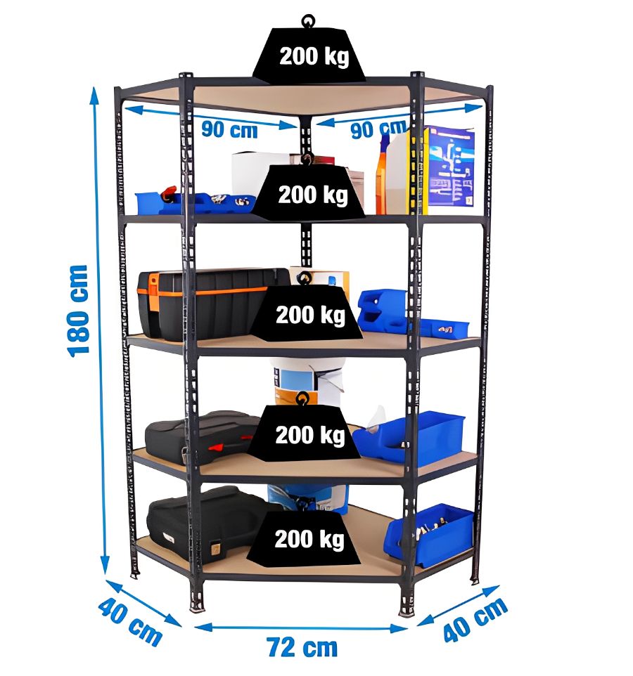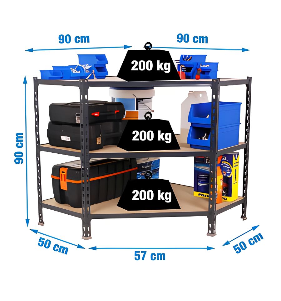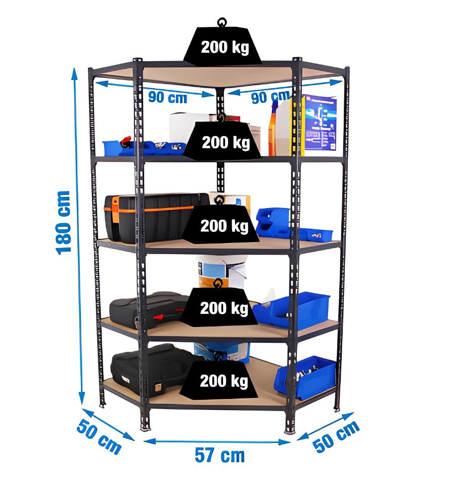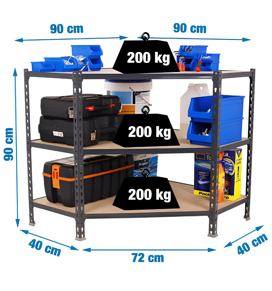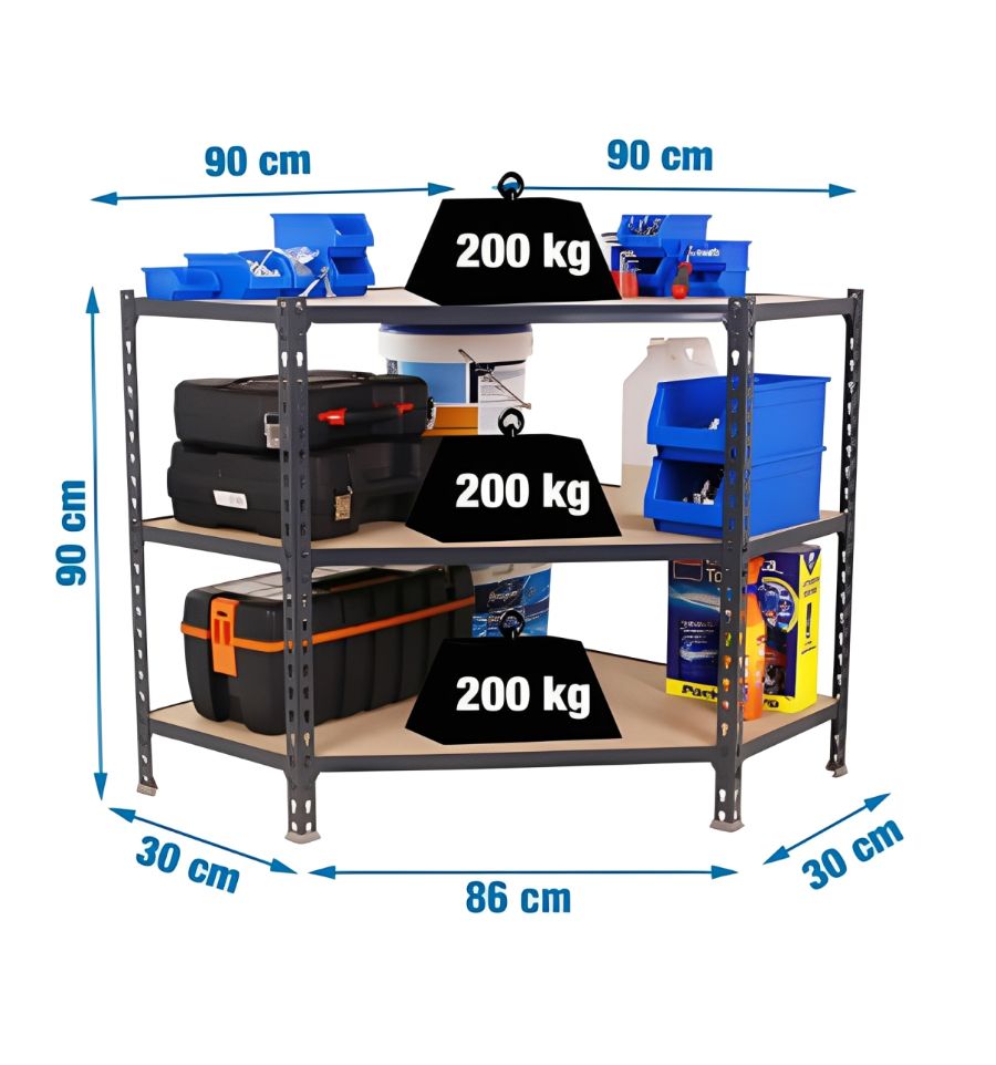 Ce rayonnage d'angle est robuste avec une capacité de 200 KG par étagère.