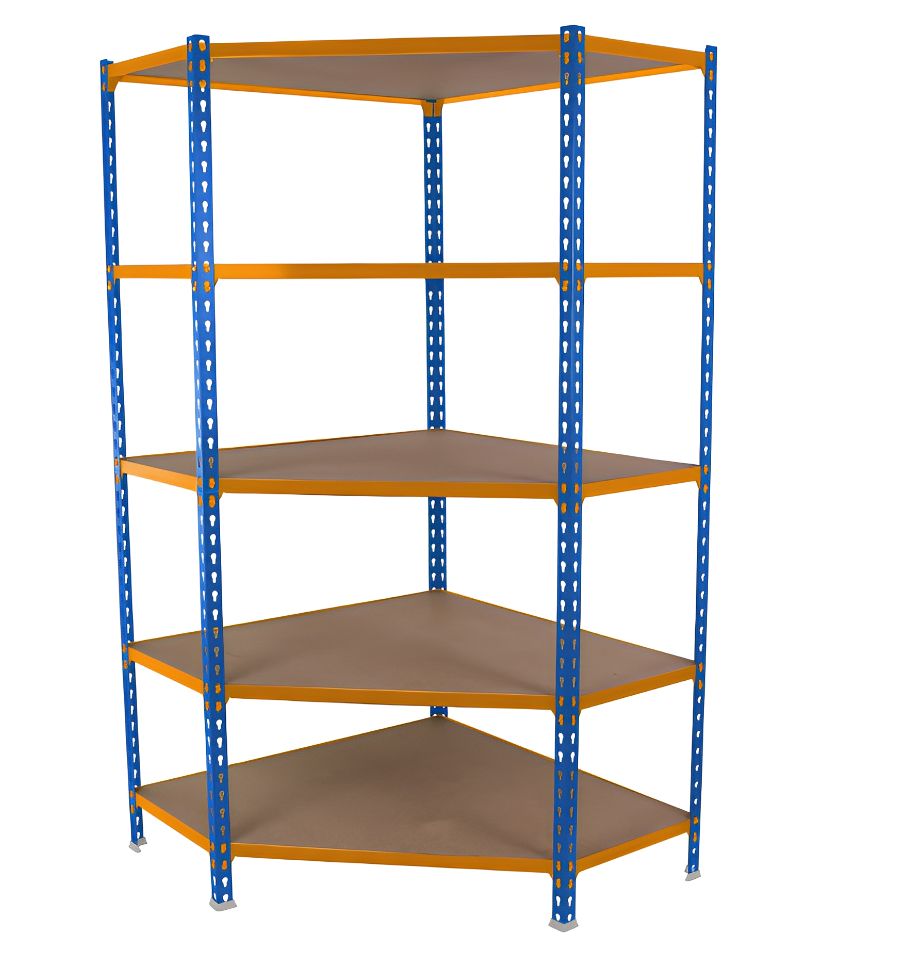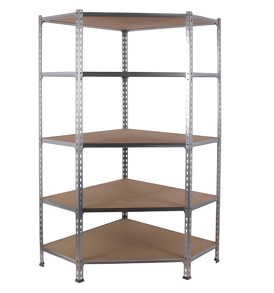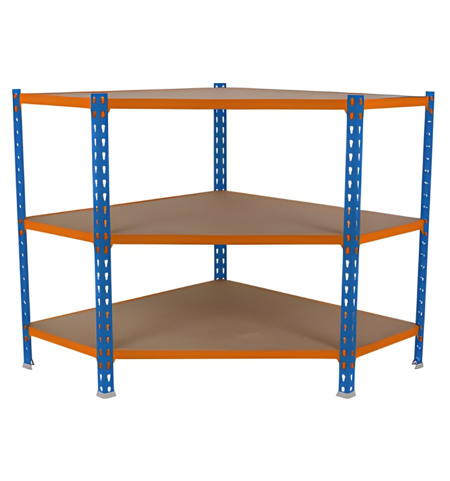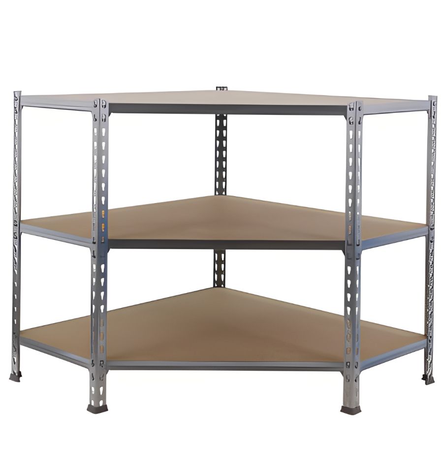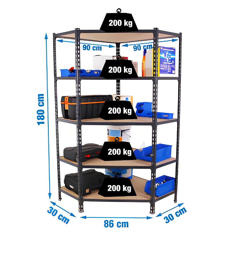 Ce rayonnage d'angle est robuste avec une capacité de 200 KG par étagère.