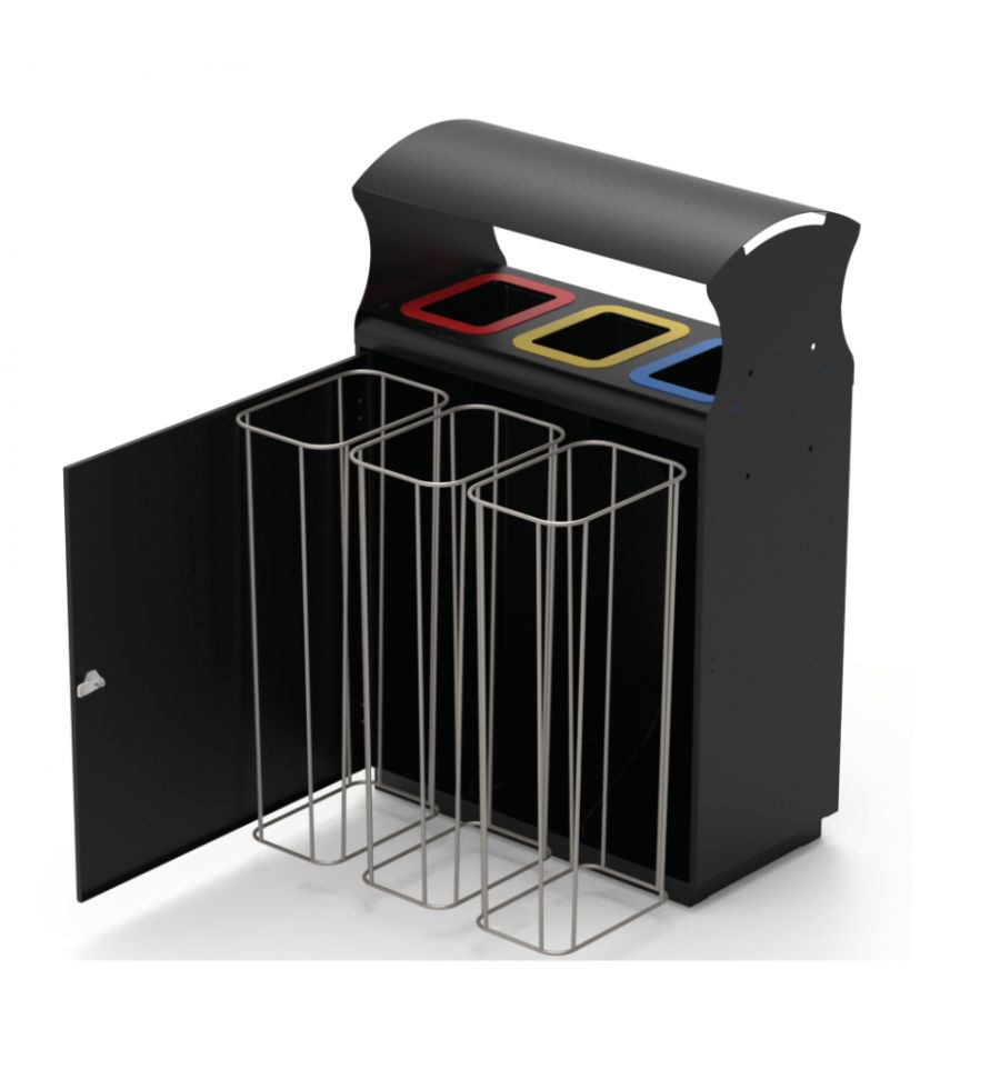 Équipée d'une serrure à clé triangle, la corbeille tri sélectif extérieure possède des porte-sacs en fil d'acier.