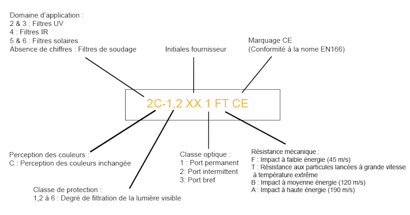 La norme EN 166 garantit la protection individuelle de l'œil. Pour que la paire de lunettes soit en conformité avec cette norme, elle doit contenir les informations suivantes sur ses verres :