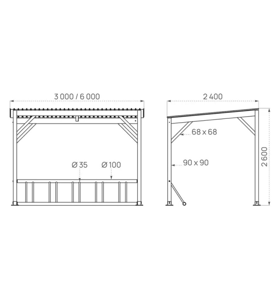 - Poteaux de structure : Bois résineux traité autoclave 90 x 90 mm