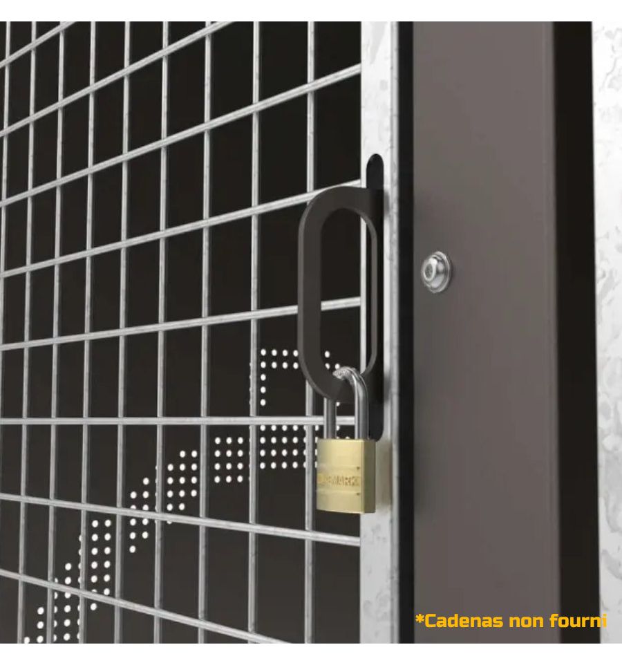 La fermeture par cadenas sécurise l'abri et permet à n'importe quel cycliste muni de son cadenas de garer son vélo. L'abri vélo sécurisé est muni de rangements pour les accessoires du cycliste.
