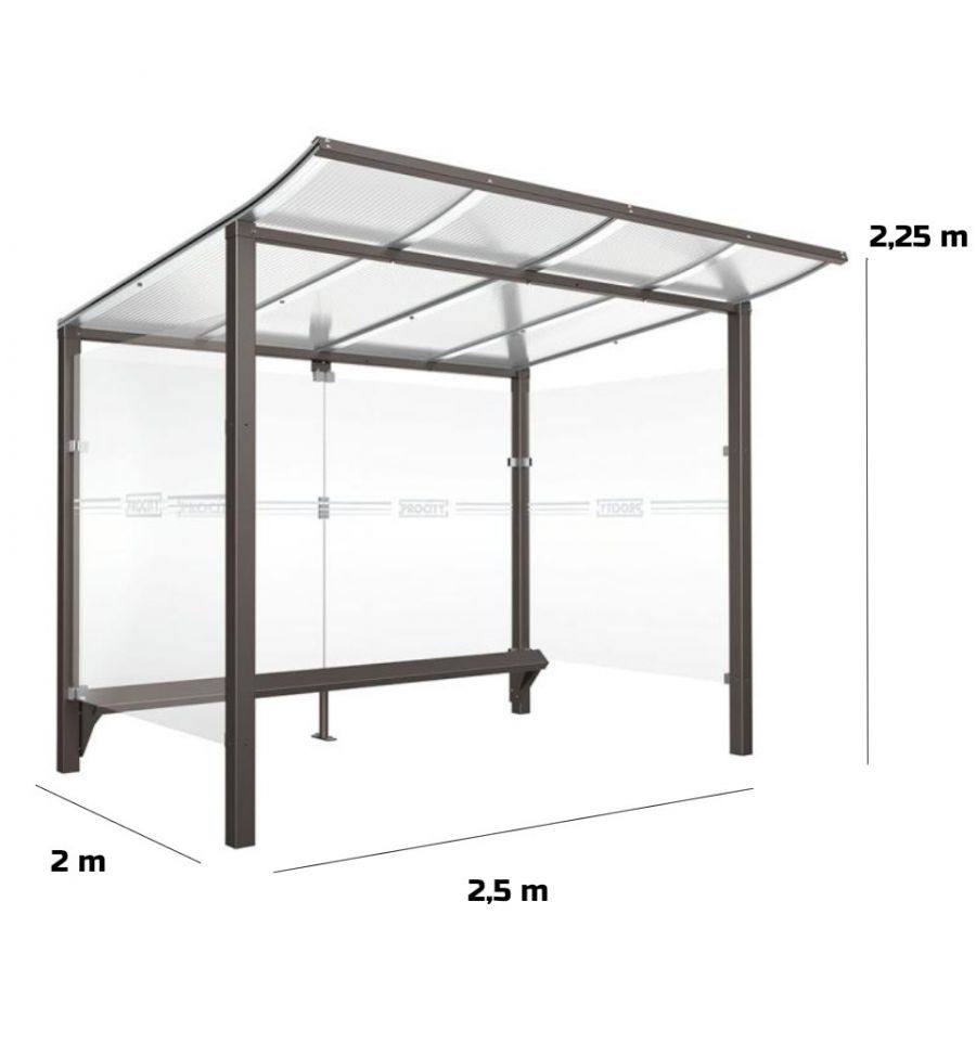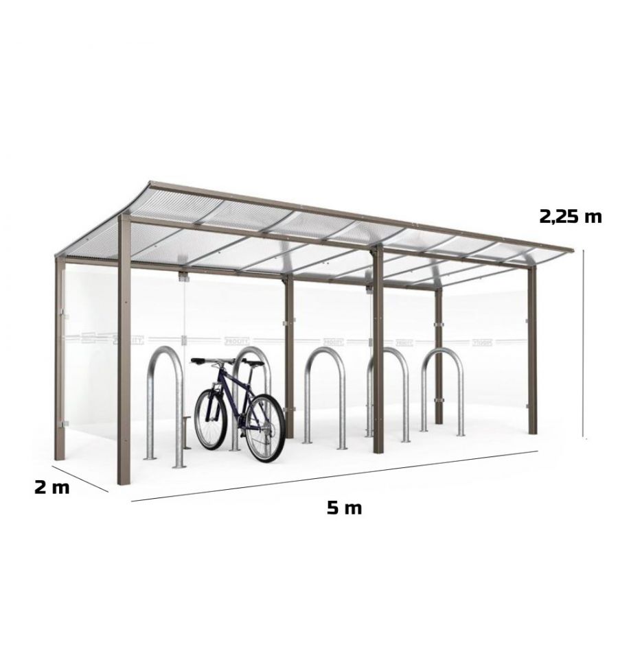 Cet abri vélo a une profondeur de 2 mètres. Il est disponible avec ou sans bardages et il peut être à scellé ou sur platine. L’abri vélo collectivité est proposé en 10 couleurs et son toit est légèrement courbé. Sa longueur est de 2,5 mètres et sa hauteur de 2,25 mètres.