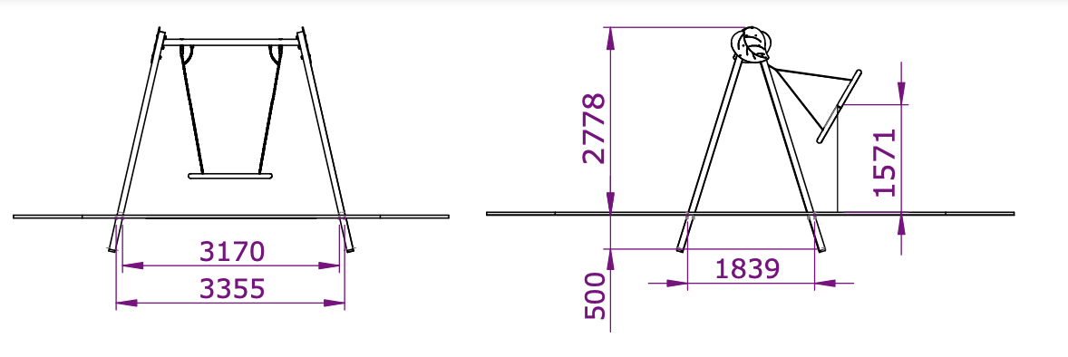 La structure de cette balançoire publique mesure L. 335 x l. 183 x H. 277 cm avec une hauteur de chute libre de 157 cm.