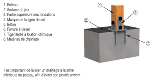 - Scellement béton dans des fouilles creusées à 50 cm de profondeur (plan d'implantation fourni avec la balançoire)