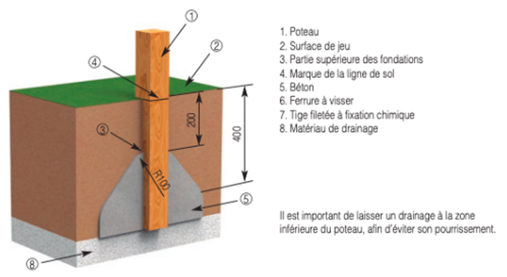 La fixation de l'ossature se réalise par scellement direct ou platines, sur des sols fluents (gravier, sable, fragments d'écorce, copeaux de bois) ou bien des sols dur (sol de type synthétique).