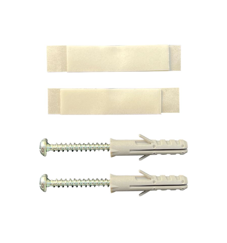- Fixation par vis (fournies) dans les trous pré-établis. Cette méthode de fixation est solide et durable. Après avoir percé des trous dans votre surface d'accroche, placez la plaque sur la surface puis utilisez les vis fournies ainsi qu'une visserie adéquate (non fournie) pour la fixer.