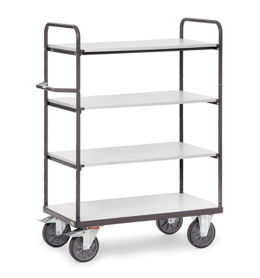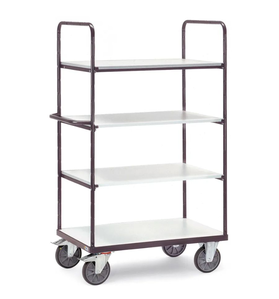 Ce chariot ESD à plateaux est également ergonomique. Il est doté de quatre roues dont deux avec freins, garantissant une excellente maniabilité et une grande stabilité.