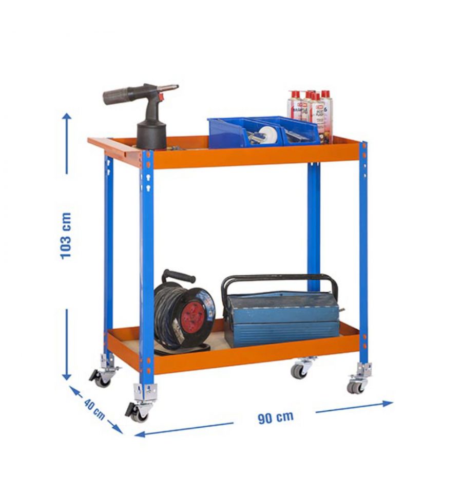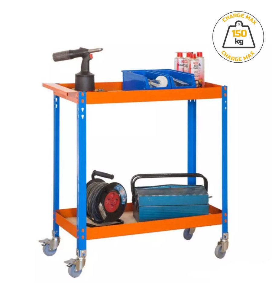 L'établi en acier galvanisé possède 2 étages et 4 roues. Il est disponible en couleur bleu/orange.