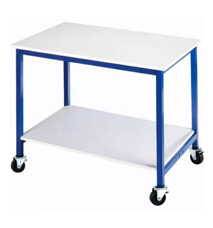 Ses pieds sont de couleur bleu RAL 5010 et le plan de travail en mélaminé d'épaisseur 18 mm est gris.