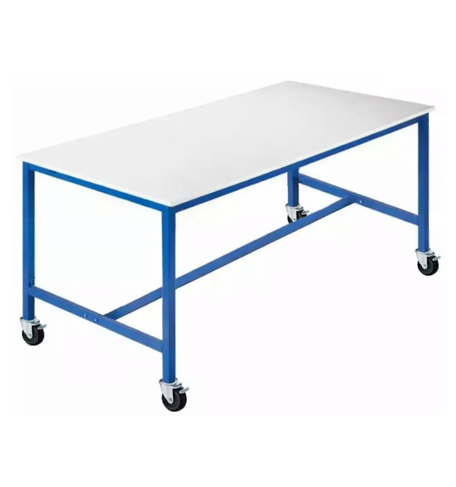 Ses pieds sont de couleur bleu RAL 5010 et la surface de travail est de couleur grise. Le plan de travail en mélaminé offre une épaisseur de 1,8 cm.