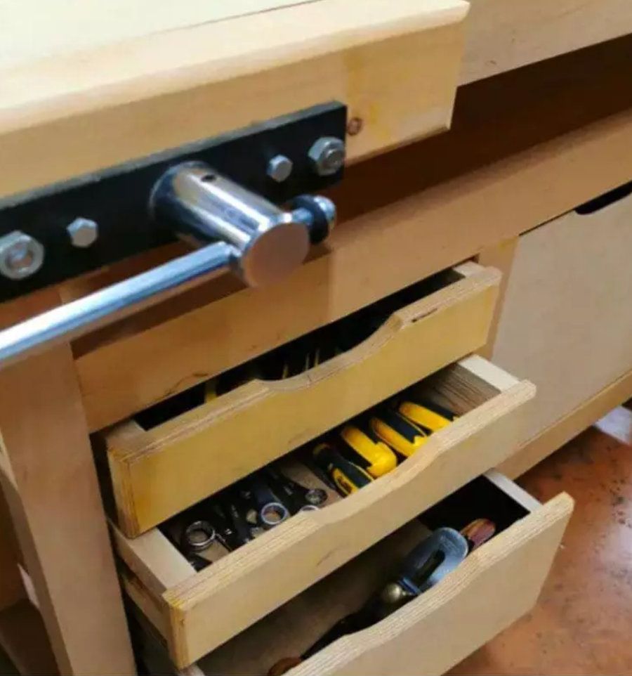 Les dimensions de l'établi en bois massif sont L. 1500 x l. 500 x H. 820 mm et son piètement est de 50 x 40 mm. Son plateau peut supporter une charge allant jusqu'à 150 kilos. Chaque tiroir peut supporter 10 kilos.