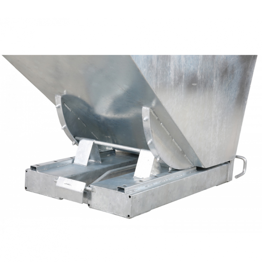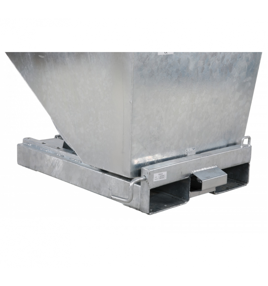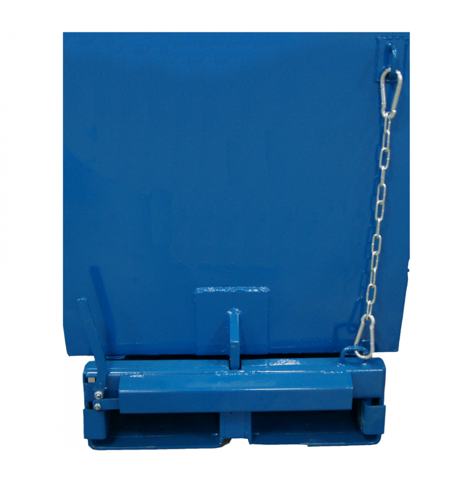 Cette benne basculante en acier est aussi équipée de fourreaux pour chariot élévateur afin d'effectuer le déversement de son contenu en toute sécurité. Le basculement et le vidage du contenu de la benne s'effectue par déclenchement automatique lorsque l'avant de la benne équipé d'un plateau sur ressort touche le rebord du collecteur final. Pour plus de sécurité, nous vous conseillons d'ajouter la chaine de sécurité (en option) lorsque vous utilisez cette benne avec un chariot élévateur. Celle-ci permet de maintenir relié la benne au chariot et ainsi d'éviter qu'elle ne glisse de celui-ci.