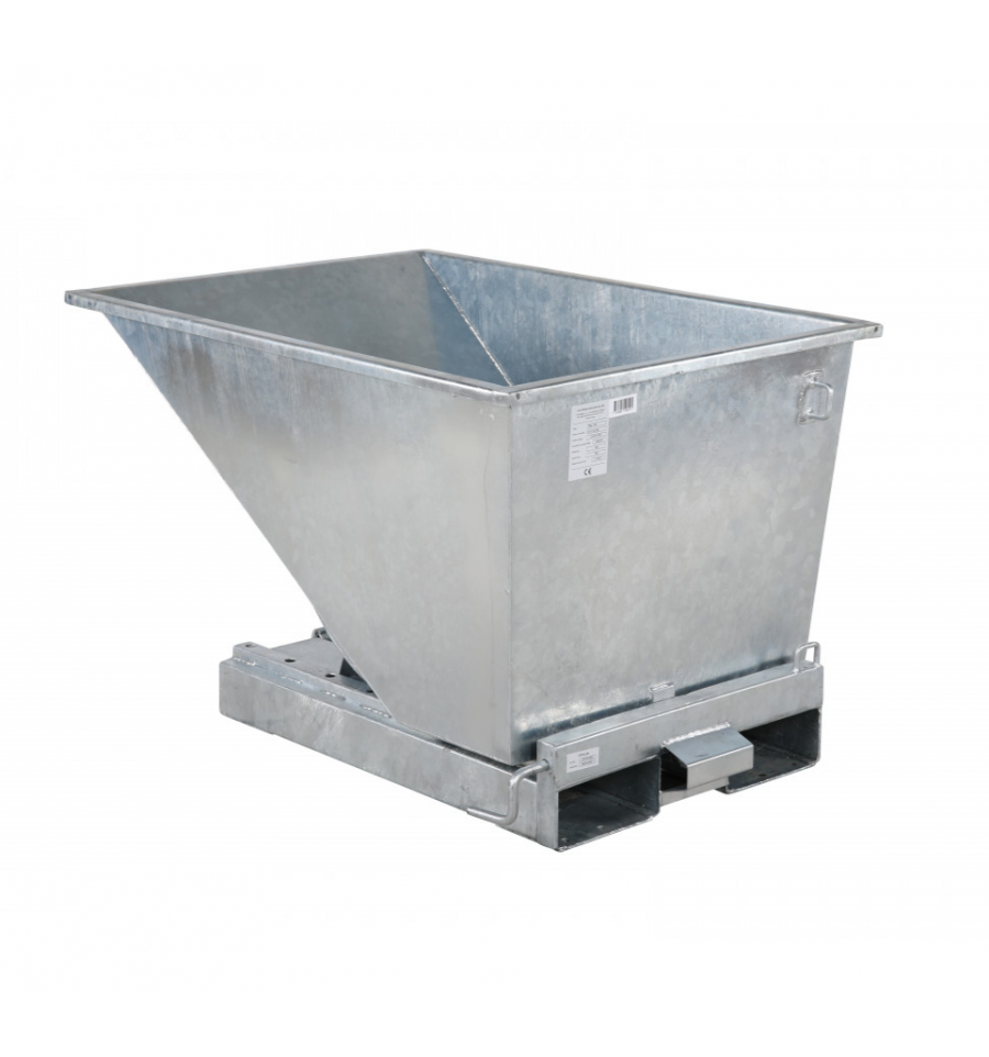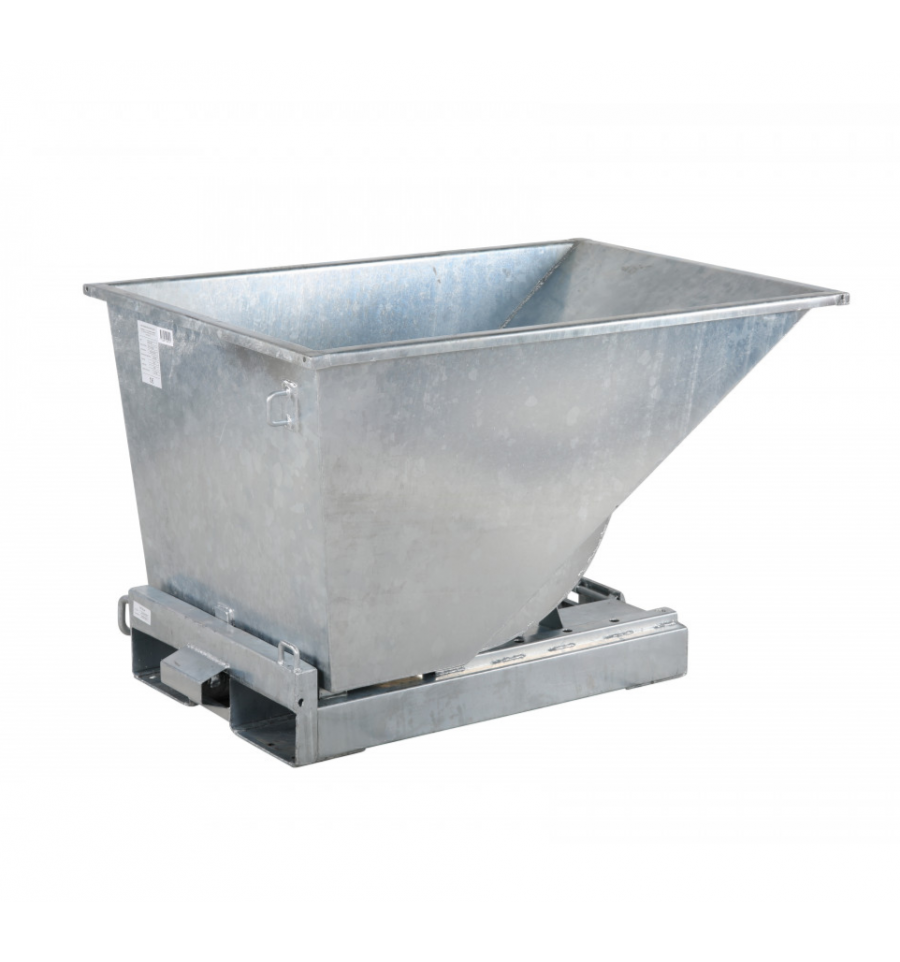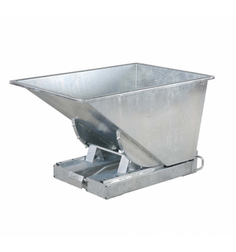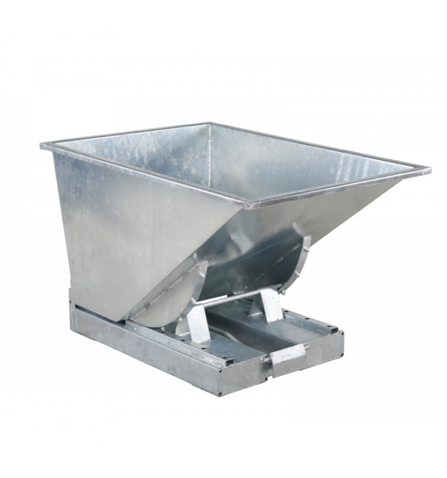 Benne auto basculante pour chariot élévateur en acier galvanisé à chaud. Elle est adaptée aux charges lourdes et corrosives telles que des pièces en acier, gravats etc… Cette benne est très résistante aux intempéries (pluie, grêle, etc…). Capacité maximale de 300 à 1100 L ou charge maximale supportée 2500 kg selon les modèles. Déclenchement automatique du basculement. Manutention et déplacement par chariot élévateur.