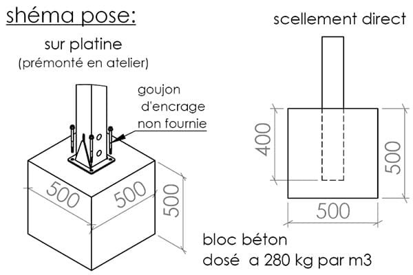 Le scellement ou l'encrage avec platines doivent être réalisés dans un bloc béton de 50 cm³ dosé à 280 kg par m3.