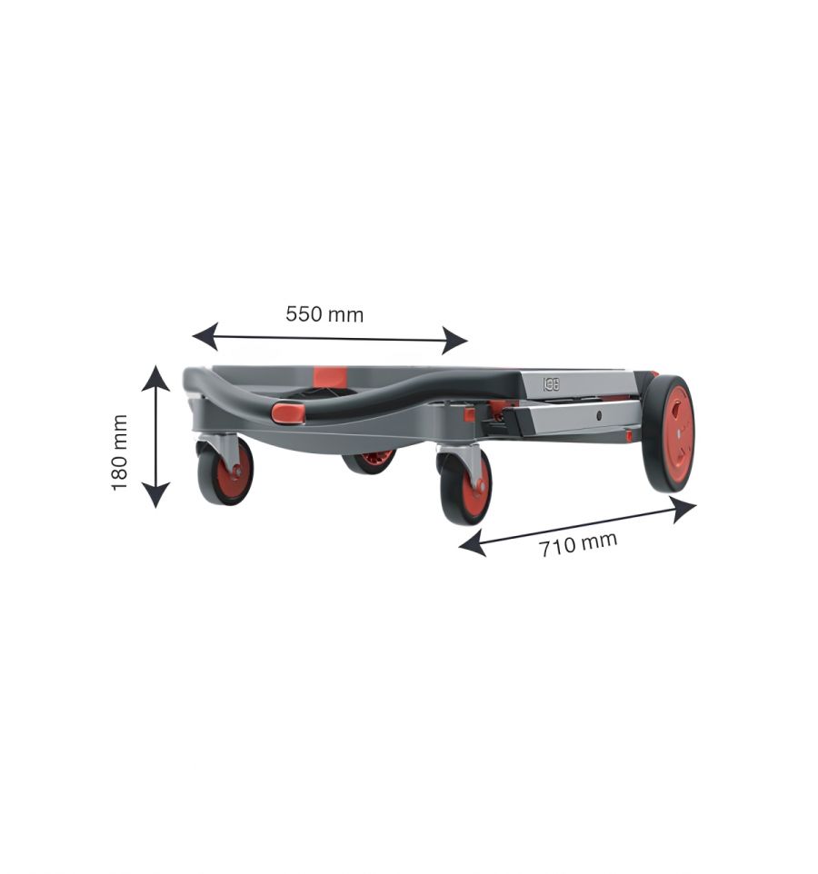 - Plié avec les roues attachées : L. 550 x l. 710 x H. 180 mm