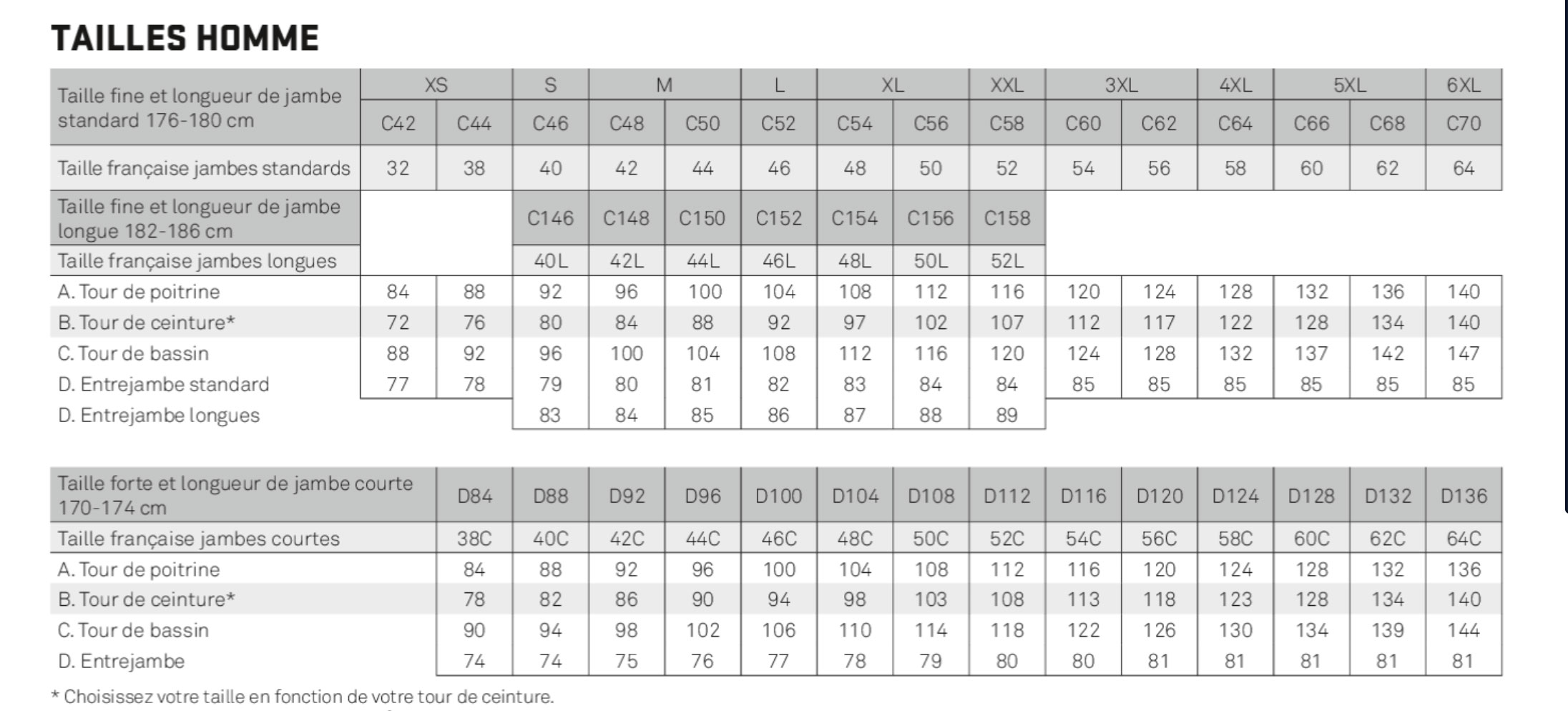 | Taille | 38 | 40 | 42 | 44 | 46 | 48 | 50 | 52 | 54 | 56 |