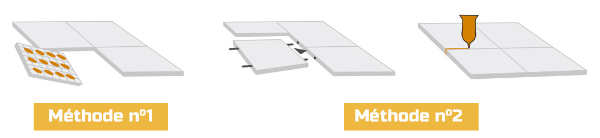 - En connectant les dalles à l'aide de connecteurs de fixations (proposées en options). Si vous optez pour cette méthode de fixation, vous devrez connecter vos dalles en quinconces. Vous devez ensuite ajouter de la colle PU59 sur la tranche de chaque connecteur.