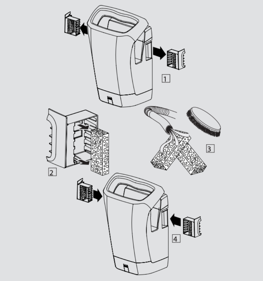 Pour le modèle de sèche-mains Copt'air, un nettoyage régulier du filtre est possible avec une soufflette.
