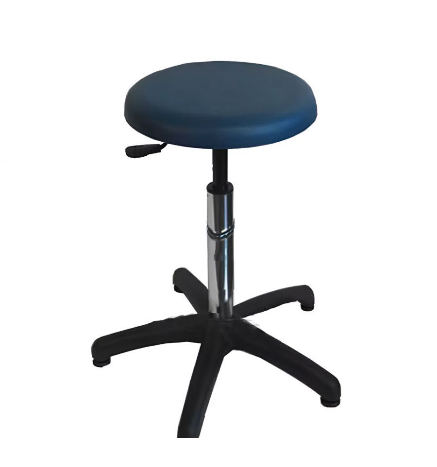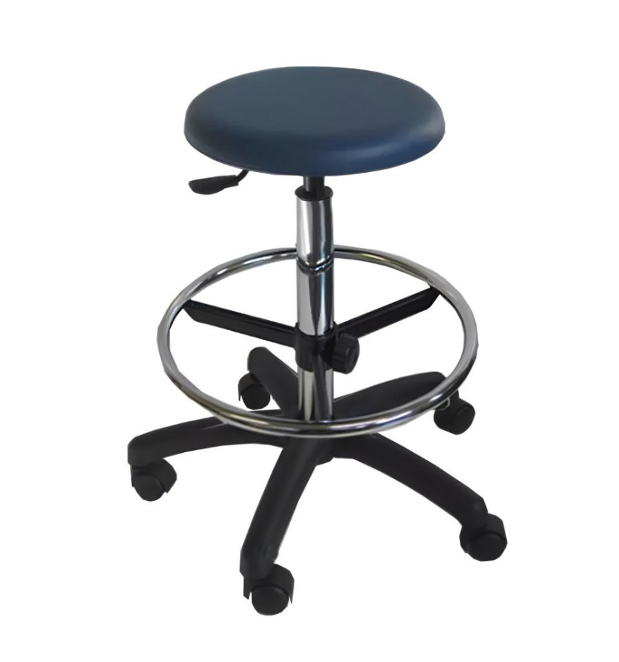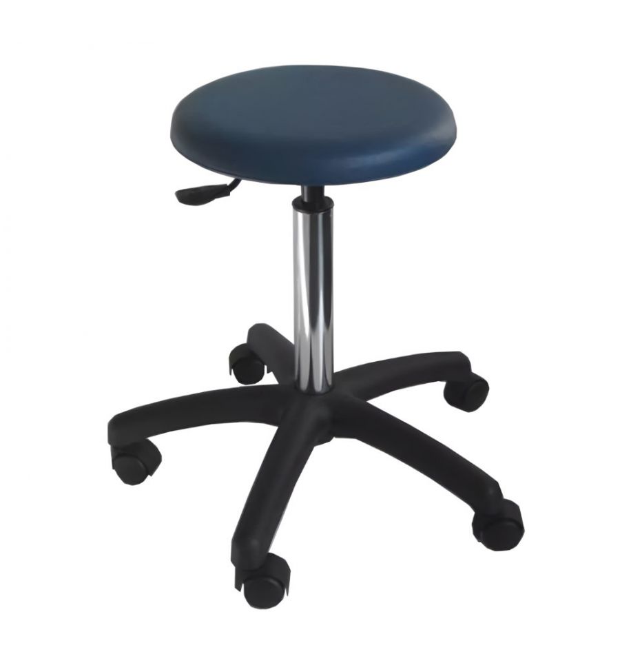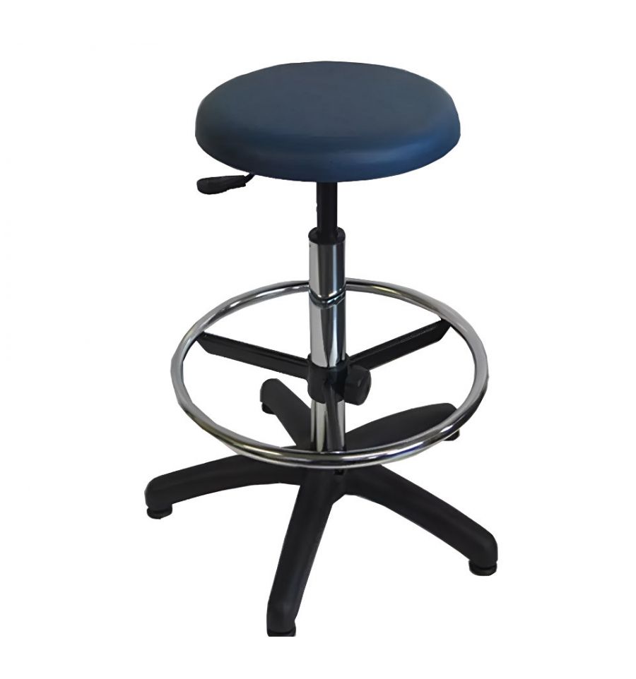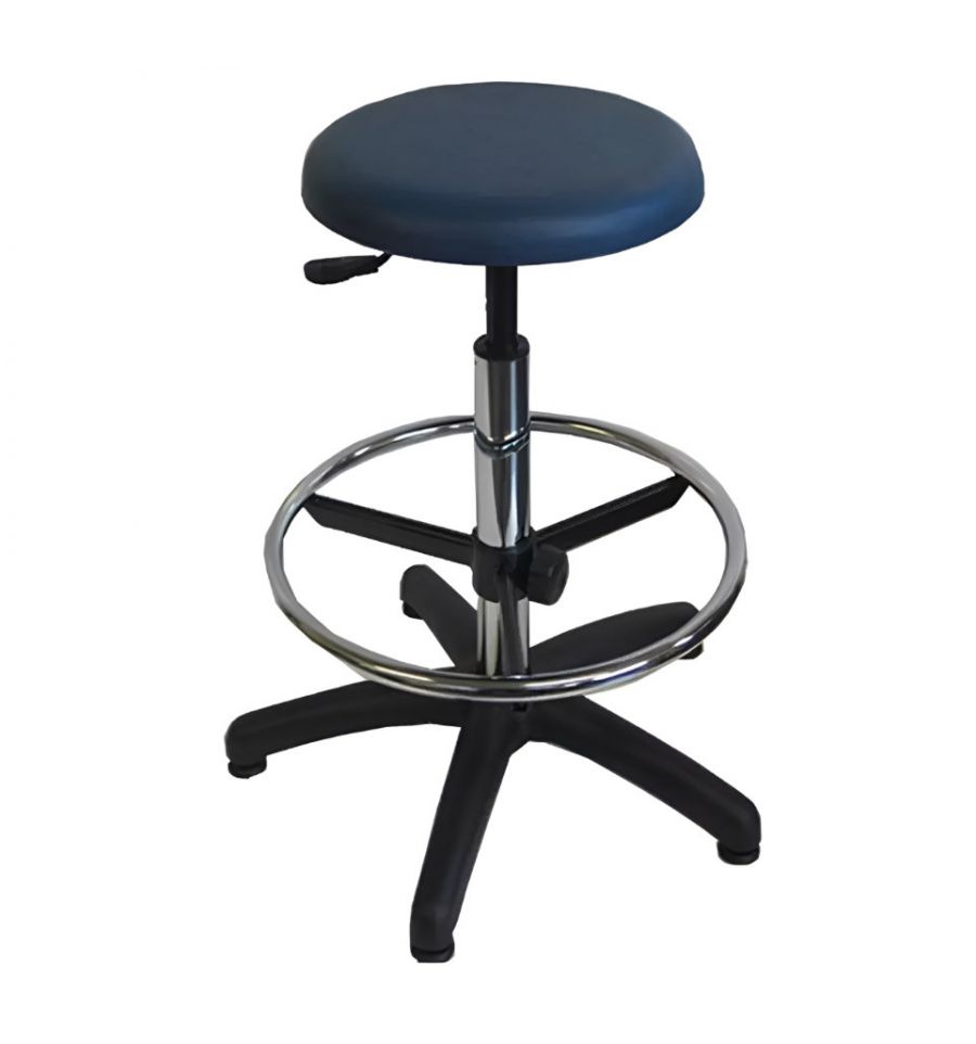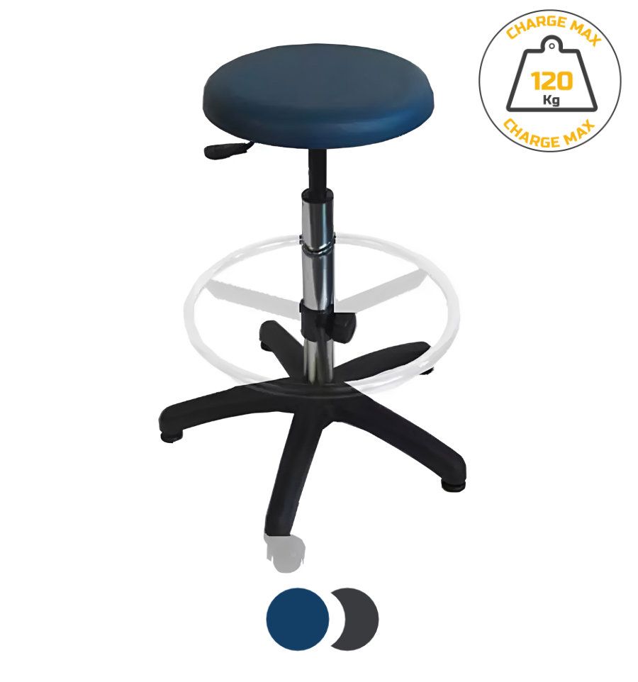 Le tabouret d'atelier réglable en hauteur est disponible en noir ou bleu. Son revêtement en vinyle permet un nettoyage facile.