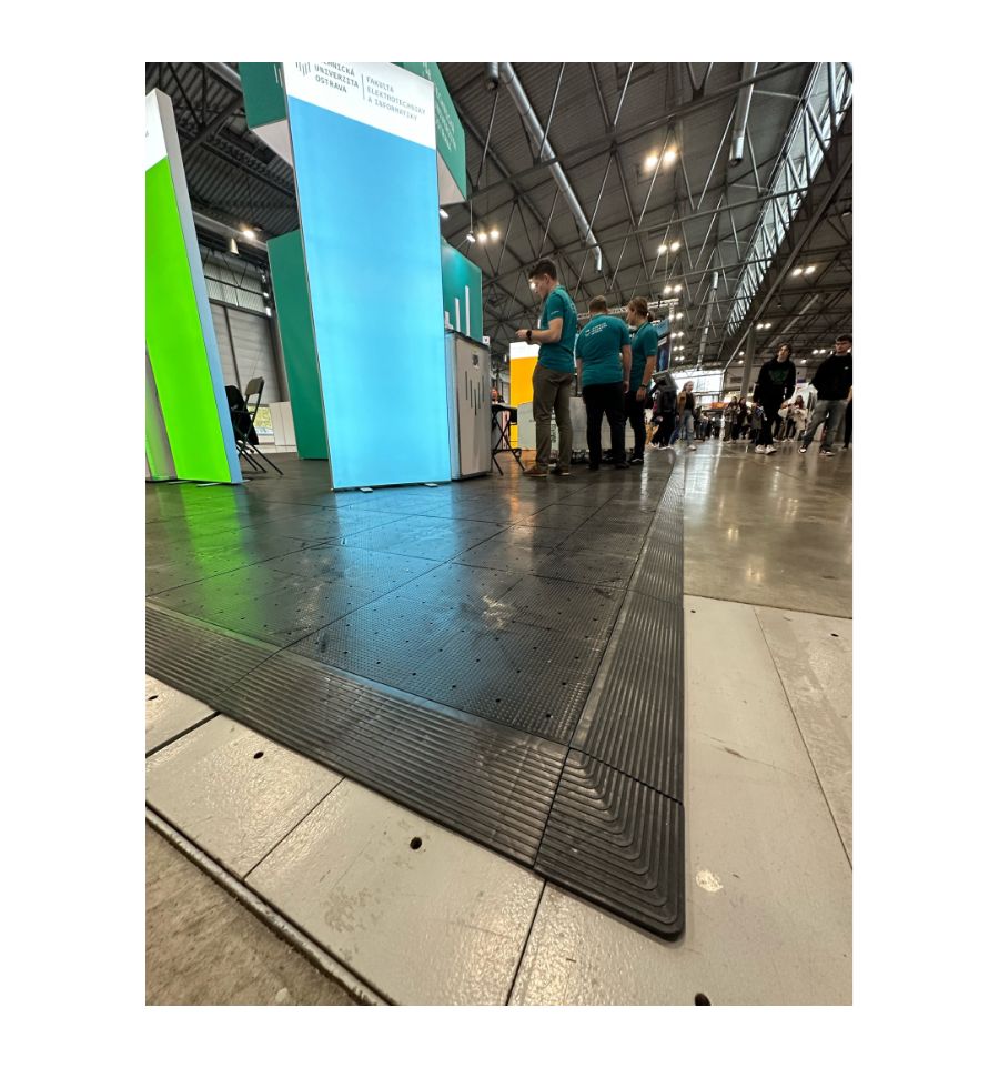 Ces dalles événementielles peuvent supporter une charge allant jusqu'à 130 tonnes par m². Fabriquées en polypropylène ou polypropylène recyclé, elles s'utilisent aussi bien en intérieur qu'en extérieur, sur des surfaces planes ou des terrains abîmés. Elles sont idéales pour des festivals, par exemple.